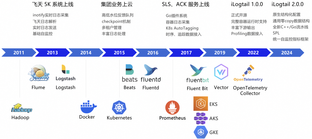 早在 2013 年,iLogtail 的第一个版本就随着飞天 5K 系统上线。飞天5K项目是一个调度 5000 台计算机合力为一个超级计算机的分布式操作系统项目,当时研发 iLogtail 的目的也很简单,将分散在几千台机器上的日志数据统一收集到一个中心数据仓库中,方便查阅和分析。在这一阶段,iLogtail 的技术投入重点是基础日志采集,典型的技术功能点有通过 inotify 感知日志变更实现日志实时采集、飞天日志解析完成结构化、实时将日志发送到远端存储、基础的自监控日志上报等。时间来到 2015 年,阿里巴巴开始推动集团业务上云,大家所知道的 2019 年双 11 宣布核心系统全面上云,其实这一过程从 2015 年就已经开始了。在这一过程中,iLogtail 的用户从阿里云扩展到整个集团,对其处理能力的丰富程度和稳定性就提出了更高的要求,iLogtail 也在这种背景下打磨出了一身过硬的本领,比如帮助故障隔离的高低水位反馈队列、防止日志丢失的 checkpoint 机制、多租户管理能力以及更丰富的日志处理能力。来到 2017 年,随着 SLS 的正式商业化和 ACK 服务上线,iLogtail 的用户数呈现几何级增长,新的需求如雨后春笋般涌现,同时 iLogtail 的使用场景也从主机扩展到了容器。为了适应新环境的变化,iLogtail 演化出了 Go 插件系统,在这一子系统的加持下,iLogtail 迅速支持了容器日志采集、K8s 元信息自动打标等功能,同时也开始往时序、追踪数据的接入开始迈进。在 2022 年,iLogtail 正式向外界完整开源,并且将版本提升到 1.0.0,这也标志着 iLogtail 的技术成熟,从一个单一的日志采集器蜕变为功能完整的可观测数据采集器。1.0 系列实现了对常见容器运行时的完整支持,适用于云原生环境,同时在开源社区同学的努力下,丰富了其对下游生态的输出支持,同时紧跟时代步伐,增加了对可观测性数据的第四根柱子——Profiling 的数据接入支持。2024 年,在 iLogtail 开源两周年之际,iLogtail 发布了 2.0.0 版本,该版本结合社区贡献、顺应市场变化在易用性、性能和可靠性方面,相对 1.0 系列版本均有显著提升。同样是这段时间,如果我们将视线放眼全球,那么我们可以看到,iLogtail 的发展历史也是云计算发展历史的一个缩影。2011 年,Hadoop 1.0.0 版本正式发布,它标志着大数据技术的成熟和广泛应用。同年,Hadoop 技术栈中为采集大数据而生的 Flume 也正式开源。2013 年,具备更灵活的数据采集和处理能力的 Logstash 发布了其 1.0.0 版本。2014 年,Docker 1.0 发布,标志着容器时代的序幕拉开。2015 年,Kubernetes 1.0.0 的发布正式开启了计算范式的革命,使容器和微服务成为现代 IT 基础设施的重要组成部分。2016 年,在这样的背景下,与 K8s 有着更友好集成的 Beats 和 Fluentd 开源并发布了他们的 1.0.0 版本。2017 年,K8s 生态中指标采集的事实标准 Prometheus 发布了 2.0 版本,这一发布标志着 K8s 监控系统的成熟。2017-2018 年,阿里云、亚马逊 AWS、微软 Azure 相继发布了各自基于 K8s 的商业化容器计算产品,而谷歌也正式将其容器计算产品更名为 GKE。这些事件标志着 K8s 这一容器编排引擎的成熟和大规模使用。2019 年,耳熟能详的可观测数据采集代理 FluentBit、Vector 和 OpenTelemetry Collector 均在此年发布了 1.0.0 版本。其中 FluentBit 主打高性能和低资源开销的日志采集、Vector 则具备更强的指标采集能力和处理编排能力、而 OpenTelemetry Collector 主打生态,数据源最为丰富,并且致力于推动可观测数据的标准化。