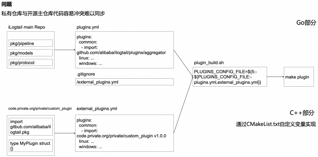 已经有许多开发者基于 iLogail 开发了自己的可观测采集代理版本,在二次开发的过程中,存在如何将私有仓库的代码与开源代码联合编译的问题。如果处理不当,可能导致代码冲突,难以跟上社区节奏向后演进。为了解决这一问题,社区成员朱舜佳提出了一种外部仓库集成方案。这一方案的大致思路是在 Go 部分,使用 plugins.yml 和 external_plugins.yml 两个文件在预编译阶段注册插件。其中 iLogtail 主仓库维护plugins.yml,并忽略external_plugins.yml,而私有仓库则维护自己的 external_plugins.yml 版本。在预编译时,预编译脚本会根据环境变量自动合并两个文件的内容,生成完整的 go.mod 和 Go 源码,然后进行完整代码的编译。在 C++ 部分,与私有仓库的融合则是通过 CMakeList.txt 中的自定义变量进行实现,有兴趣的同学可以参阅社区文档:https://github.com/alibaba/ilogtail/pull/1708。经过上述一系列关键点的优化改造,iLogtail 的开发者体验得到了显著提升,不仅大大提升了开发效率,同时也为社区的持续繁荣和发展奠定了坚实的基础。
