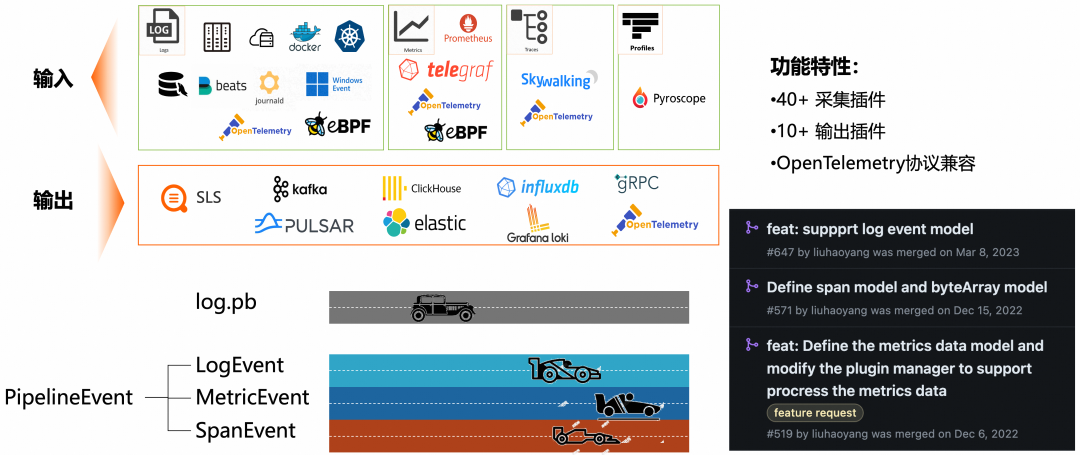 在最初的日子里 iLogtail 只有日志采集的单一功能,在这一阶段,iLogtail 的技术投入主要在解决如何将日志实时、稳定地采集上来,主要难点在于适应不同的日志轮转策略、不同的实例流量特征、各种网络异常或发现下游异常的情况等。随着云原生、 K8s 的兴起,iLogtail 需要支持容器内标准输出和容器内文件的采集。起初 iLogtail 完全使用 C++ 编写,缺乏容器发现能力,只能与容器产品绑定,由容器产品提供容器元信息。但不久后 iLogtail 就使用 CGO 接口研发了 Go 插件系统,并通过 Go 插件打通与本地 docker.sock 的通信机制补齐了容器发现这一短板。如图所示,Go 插件流水线主要由 Input、Processor、Aggregator、Flusher 4 个部分组成,Processor 的输入不仅可以来自 Go Input,也可以来自 C++ 文件,Flusher 不仅可以输出到 SLS,而且已经具备输出到第三方存储的能力。Go 插件系统的引入,为 iLogtail 后续引入新数据源打开了新世界的大门,在随后的版本中 system-journald、windows event、mysql binlog 等日志数据源被迅速引入,iLogtail 在日志数据源丰富度上得到了极大的加强。不只是日志(Log),在 Go 插件系统的帮助下,iLogtail 逐步往所有类型可观测数据采集迈进,逐步引入了指标(Metric)、追踪(Trace)和剖面(Profile)的采集支持。而开源后,在社区成员的共同努力下,Go Flusher 往第三方存储输出的潜能被完全释放,支持了如 Kafka、ES、CK 等热门存储。如今 iLogtail 已经具备超过 40 种采集插件、10 余种输出插件并且完全兼容 OpenTelemetry 协议输入输出。那么在 iLogtail 插件生态繁荣的背后,我们也不断在演进支撑插件的 Go 插件框架。其中最值得一提的是我们对数据结构通用化的改造。由于历史原因,Go 插件框架内部使用的数据结构是一个 Log 的 protobuf,虽然它可以很高效地表达日志数据,但对于其他数据的表达却显得生搬硬套,这也导致了开发指标、追踪、剖面等插件十分拧巴,数据处理效率也比较低下。因此在社区 PMC 成员刘浩杨的推动下,我们将 Go 的流水线升级到了 V2 版本,使用了 PipelineEvent 这一通用的可观测数据结构,具体的 LogEvent、MetricEvent、SpanEvent 从它进行派生,它们各自可以为自身的数据特点进行优化,表达更加自然,处理起来也更加高效。在 iLogtail 2.0 版本中,不仅是 Go 插件系统,iLogtail 的 C++ 插件系统也完成了通用化数据结构改造,至此指标、追踪、剖面数据都可以流畅地进行表达,甚至可以派生出新的数据结构,整个插件框架完成了从日志到通用可观测数据底座的转型。