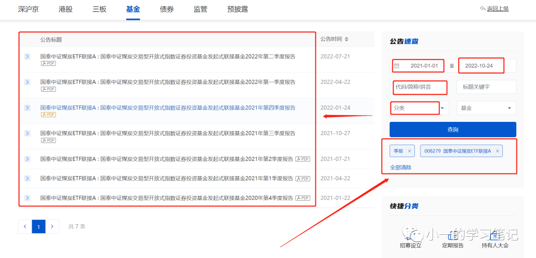 在右边的框里,选择开始时间和结束时间,基金代码输入对应的6位数字【或者简称也行,会有提示】,分类可以选择年报、中报、季报等