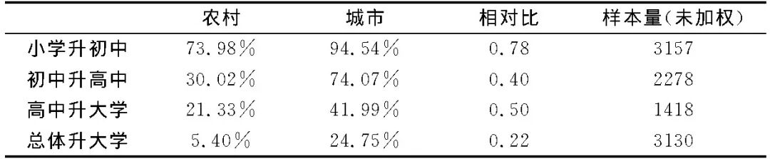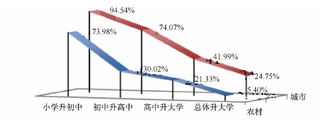 表2描述了城乡子弟在不同教育阶段的升学比例。表格最后一行是城乡总体升入大学的比例,可以发现,农村子弟最终升入大学的机会要远低于城镇子弟,仅为后者的约1/5。然而,在高中阶段,农村子弟的升学机会则占到城镇子弟的1/2。因此,大学中农村子弟比例偏低并非完全由高中升大学阶段的教育筛选造成。继续观察初中升高中阶段的教育进阶会发现,农村子弟的升学处境更糟糕,其升学比例仅占城镇子弟的2/5,而绝对差距则达到44.1%。小学阶段差距不大,两者差距不到1/4。因此,本文认为,城乡高等教育入学机会的不平等并非完全由某一阶段造成,而是逐级教育筛选的结果。在这一过程中,初中升高中阶段的贡献最大。为便于直观观察城乡子弟教育机会不平等的概况,本文将表2绘制成图1。