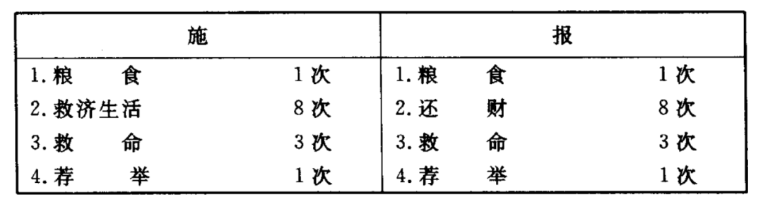 这种关系,可以约如上表。从这个表来看,报都比施厚一些,性质也较为接近而有普遍化的倾向。由于报恩(或德)成为社会行为中的一个普遍法则,即接受了恩惠的人,必须在可能的范围或时间内回报,施惠的人也就容易产生一种预期回报的心理,这就形成为一般原则,所谓“礼尚往来”。尽管有不少人警告自己施惠勿念,事实上很难做得到,因为另一面却在鼓励人报恩。既然是必报,就必然会产生回报的预期,也即是另一次的交换行为。正如刘向说的,