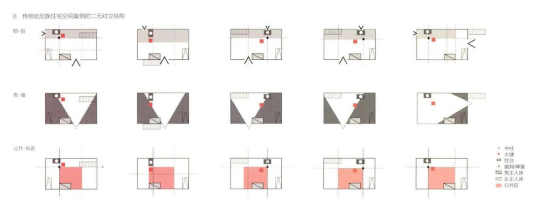 以入口方向限定,可将哈尼族住宅空间划分为“前-后”两区:距离入口较近的“前区”进深较大(3~4m),容纳用餐、起居、睡觉等活动;“后区”进深较小(1.5~2m),承担炊事、交通、储藏等功能。中柱通常是前后区的分界点,这亦符合中柱作为结构中心的意义。火塘同样处于两区边界,是前区起居生活及后区炊事活动皆不可或缺的运转轴心。这一分区亦体现于地面材质。前区一般采用木地板(每片宽20~25cm,厚约5cm),后区则采用泥土地面(部分改造为水泥地面)。泥土或水泥地面可更快吸收水分,方便洗菜、烹饪等“湿作业”;木地板能更好维持火塘的温暖。此外,前区是住宅招待客人的区域,使用更体面的木地板也出于家庭声誉的需要,例如近年来政府补助危房做室内整修时,很多家庭选择将有限的改造费用(每户1~2万元)优先用于前区木地板的更换。总体而言,前区是哈尼族日常生活的主区,而后区则是次要区域。“前-后”结构进而延伸出“主-次”结构。入口朝向进一步推演出“亮-暗”区隔。昏暗是传统哈尼族住宅的普遍特点,或出于夯土墙结构限制,只在灶台边开设一极小洞口(主要作用是排烟)。故二层空间最主要的光源即通往二层平台的门。当房中有人居住时,这扇门白天几乎一直开启,承担采光功能。光线将后墙照亮,而前墙则成为室内最暗的部分。“前区”和“后区”的墙由此逆转为“暗墙”和“亮墙”,即“亮-暗”结构(图7)。“亮墙”是白天活动的承载体。灶台、火塘是炊事的核心工具;灶台旁常有储水缸,旁设一矮柜,用于菜品初加工,摆放调味品及电磁炉、电饭锅等现代炊具。墙上悬挂着炊具、农具。“亮墙”的剩余宽度留给通往一层或三层的楼梯。总体而言,“亮墙”集合了需要光亮的技巧性操作及相应工具。“暗墙”则如同室内的“夜晚”。陈设床、储物柜等物件,其中靠门最近的是男主人床,两个角落分别是女主人床和儿子(及儿媳妇)的床。身处室内,面对入口处的刺眼光线带来的强烈明暗对比,暗墙及其承载的功能几乎从视线中“消隐”。“暗墙”集中了生活中更注重隐私的自然性活动及相应空间。在室内的“亮-暗”关系基础上,室内外的“暗-亮”结构同样重要。二层门外的晒台是起居空间的延伸,白天常可看到男人坐在平台的小板凳上抽水烟筒,与路过的邻里聊天;女人也将食材准备等炊事活动搬到平台上进行。前门到后墙的三角形区域因光线作用而成为住宅中的“亮区”,剩余部分为“暗区”(图8)。在这一空间观念下,“中柱-火塘-灶台-神龛-男主人床”序列分裂为两个区域——炊事、用餐、会客、交通这些日常功能皆位于“亮区”;睡觉、储藏等白天较少涉及的功能大多位于“暗区”。可谓向光而动、向暗而息。“前-后/主-次”结构也因此反转——次要的后区为光线照亮;面积更大的前区则更多掩盖于黑暗之中。这与惯常意义上“主次”到“亮-暗”的对应关系恰恰相反——如汉族住宅中,最主要的公共区域往往是最亮的。这可视为哈尼族在有限的住宅生活条件下逐步形成的惯习,进而建构起独特的基于“亮-暗”“公共-私密”关系的空间观。整体而言,传统哈尼族“对家庭公共生活的重视远远超过对个体成员生活的重视”,但在“亮-暗”结构作用下,看似不存在私密生活的大空间中实际存在“公共-私密”的区隔——暴露在“亮区”是炊事、用餐等公共性活动,睡觉、储藏等功能则处于相对私密的“暗区”。“前-后”结构不再限于功能上的抽象分区,而被赋予视觉意义上的实际区隔。光线的边界为大空间添加了两片“隐形”的墙体。“亮-暗”至“公共-私密”的关系推演中一个关键的“错位”因素是男主人床(图8)——虽处在暗区,但男主人床是开敞的,白天也可作为男主人的坐席,是公共区域不可或缺的部分;相对而言,女主人床则处在暗区角落,用蚊帐或隔墙强调其封闭性。有些住宅还在演变中另增一间耳房,称为“女儿房”,为方便长大的未婚女儿交朋友而设置,为满足更高的私密性需求。这可推演为“男性-女性”的二元对立结构。男主人床把守着住宅的门槛、也是暗区和亮区的边缘,藏匿于安全的黑暗中,又随时洞悉亮区之毫厘变化(尤其是进入住宅的入口区域),象征着男主人对住宅、尤其是公共区域的统摄以及对家庭成员的佑护。在招待客人时,餐桌摆在火塘旁靠近入口的最亮位置,男主人背靠男主人床而坐,客人和其他家庭男性成员分别坐在男主人的左边和右边;女性、小孩和老人通常在暗墙的角落另支一桌用餐。亮区是对外的、公共性的,暗区则是对内的、私密性的。男主人床处在暗区边缘的同时统摄着亮区,可视为生活性需求与社会性需求的平衡。因此,“公共-私密/男性-女性”的二元结构,是在“前-后”“亮-暗”两对功能性结构基础上叠加的另一层社会性结构。男主人床和火塘一起构成了一个以男性、人工活动(吃饭、抽烟、交流、待客等)为主的公共区域;围绕这个区域周围,则是女性、自然活动(做饭、储藏食物、睡觉、生产等)所在的私密区域(图8)。这说明,哈尼族人对于家庭生活的私密性并不像表面所见的那样微弱,反而贯穿于住宅空间的整体到细节之中。随着传统住宅的当代变迁,传统社会组织、信仰体系逐步瓦解或重建,但上述二元空间结构依然在新住宅的日常使用中得以体现,彰显了空间观的自治性。本