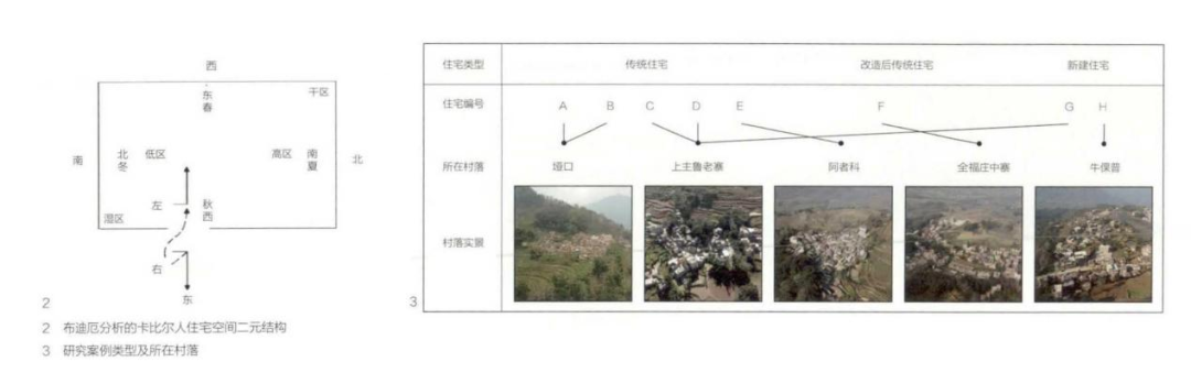 本文从布迪厄《住宅或颠倒的世界》一文的结构人类学方法出发,结合建筑测绘和田野调查,分析云南元阳哈尼族住宅的空间观。该空间观具体化地呈现于一系列二元空间结构,得以在仪式实践、亲属关系的当代变迁中保持自治,进而在人类学的社会框架下赋予空间以具有建构意义的能动性。对这一空间观念的理解和尊重是哈尼族住宅当代营建和传承的重要前提。法国社会学家皮埃尔·布迪厄(Pierre Bourdieu)1963年的经典论文《住宅或颠倒的世界》(The Kabyle House or the World Reversed)是其人类学理论的奠基性作品,亦对人类学和建筑学领域的家屋/民居研究意义深远。他深受列维·斯特劳斯(Claude Lévi-Strauss)结构人类学提出的“二元对立心理结构”影,立足于解决前人对柏柏尔人住宅空间阐释的“系统性缺陷”,提出“将物件和行为作为一个象征体系整体的部分来看待”,使家屋及其凝炼的亲属关系从宗教仪式中脱离出来,成为一个“自持的系统”(a system in its own right)。布迪厄的二元结构阐释在两个层面展开:技术和功能层面的生活观念与社会层面的信仰观念(图1)。住宅的矩形平面可见人类活动的“大区/高区”和圈养牲畜的“小区/低区”之对立;又因入口方向的影响,形成面朝入口的“正墙”(又称织布墙、亮墙)和背对入口的“背墙”(又称暗墙、睡墙)的对立。平面布局二元性不难从功能上解释:织布机在亮墙便于工作,牲畜栏在低处便于动物粪便和灰水排放。在信仰层面,阴暗潮湿的低区主要承载的“自然”活动(睡觉、生产、死亡等)和明亮干燥的高区承载的“人工”活动(待客、用火、炊事、织布等)被赋予了男女分工及社会地位的意涵,延伸出一系列并列或包含的二元对立结构——“火-水、熟食-生食、高-低、亮-暗、日-夜、男性尊严-女性尊严、授孕-可受孕、文化-自然”。男-女对立不仅存在于室内,也与“住宅-外部世界”的二元关系同构:男性生产,女性储存;男性在室外活动,女性在室内活动;男性从室内朝东运动至室外,女性从室外运动至室内——住宅室内的空间向度相对外部朝向发生180°的旋转,如同“颠倒的世界”,目的是在日常生活实践中实现最大化的仪式效益(图2)。住宅的朝向、室内外关系和室内布局,作为一个完整的二元空间结构,不仅反映了柏柏尔民族的人观和宇宙观,也是其宇宙观的构成部分。![]()