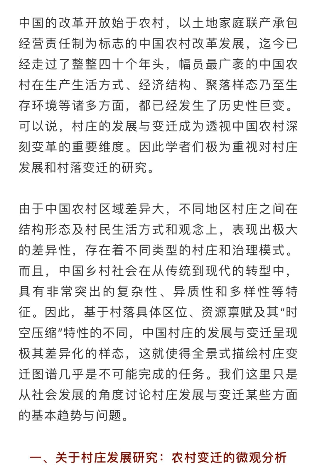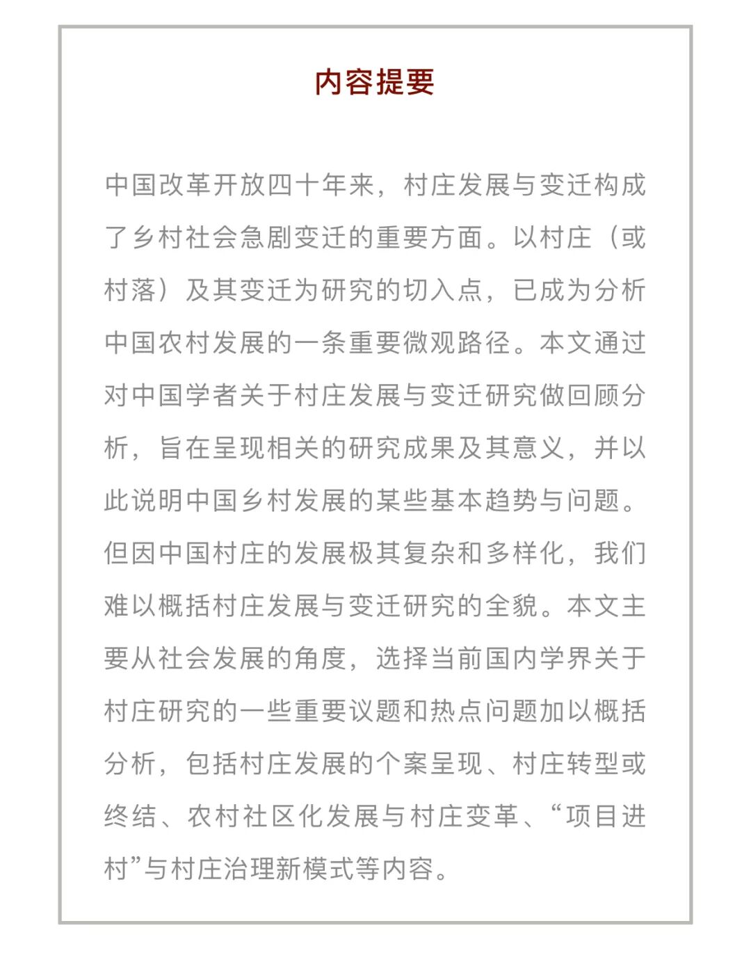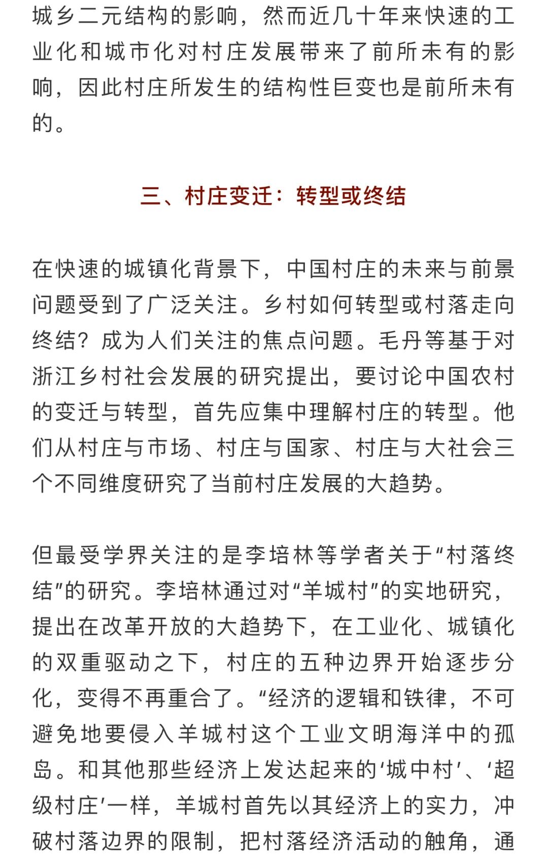 前三篇概述了改革开放以来的中国农村变迁,以整体性的视角梳理了长时段下农村转型发展的方向。专题第四到六篇关注于改革进程中的经济制度变迁,探讨工业化发展进程对于农村经济形态的影响;七到九篇则关注于乡村组织与社会结构的变迁;第十篇分析了基层政府在市场经济中的新角色,从政治制度转型方面进行分析。第十一和十二篇,视角转向中国农村发展过程中出现的城中村现象与城市化问题,从具体个案出发,选取了广州市具有特色的村落,以小见大,探讨城市化进程下的可能性。第十三篇在费孝通“乡土中国”概念的基础上,进一步提出了“后乡土中国”的概念,指出乡村发展后期所面临的基本问题是农民何以获得公平的市场机会问题,提出从制度、文化和市场的协调关系上激活乡村发展效率的运作机制,呼应了农村研究的学术传统。中国农村转型发展这一领域的相关研究十分丰富,且在当下仍具有着重要意义,限于篇幅限制,许多优秀的经验研究作品在本专题中未能穷尽,笔者才疏学浅,也请诸位读者不吝赐教。