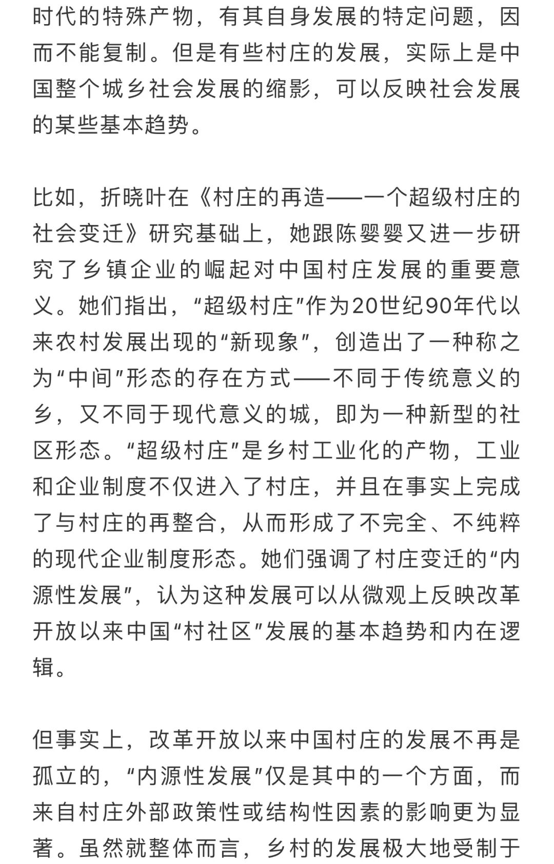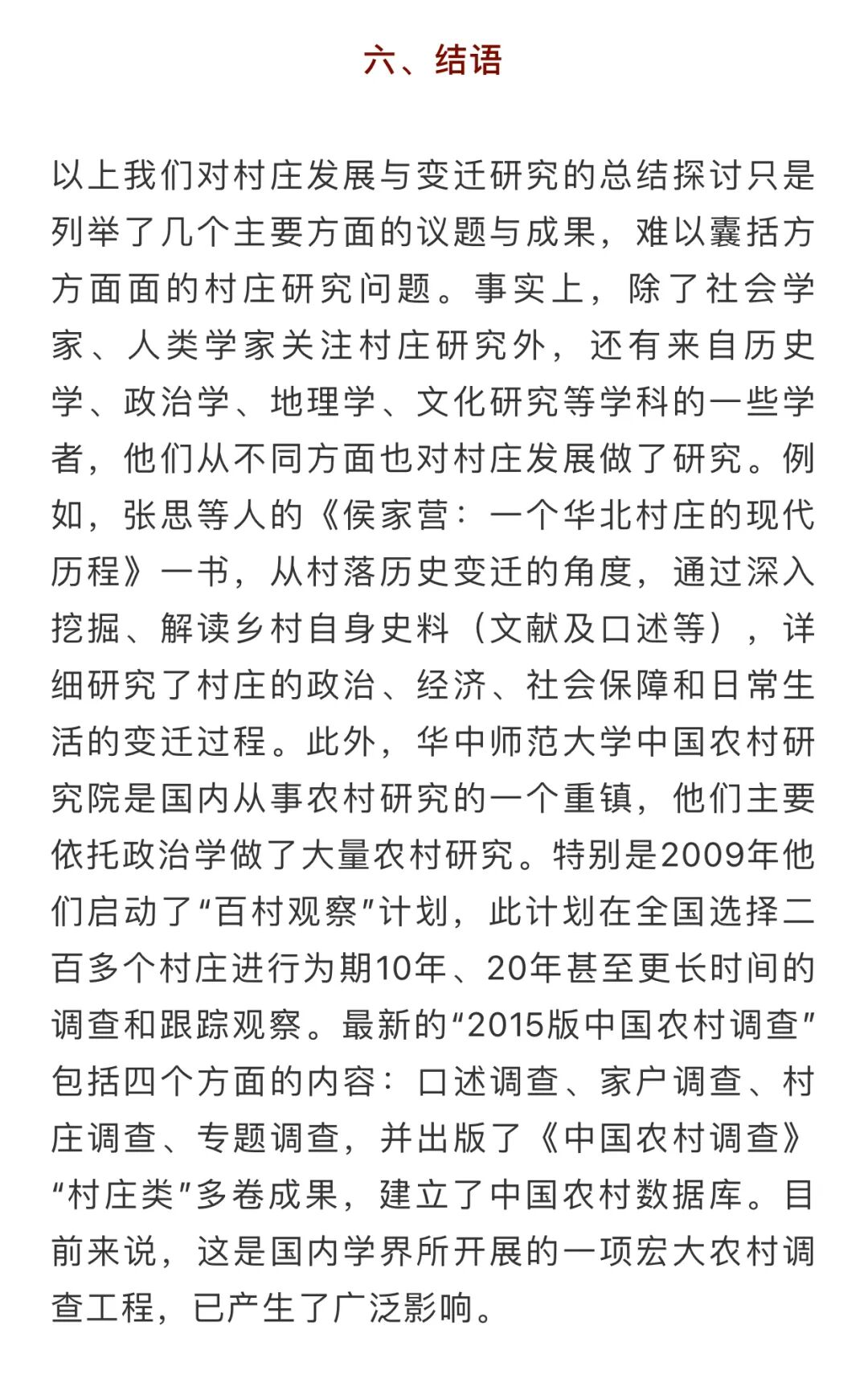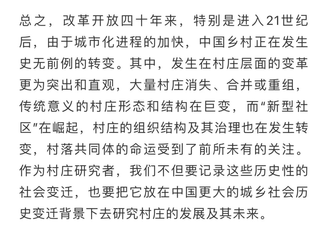 前三篇概述了改革开放以来的中国农村变迁,以整体性的视角梳理了长时段下农村转型发展的方向。专题第四到六篇关注于改革进程中的经济制度变迁,探讨工业化发展进程对于农村经济形态的影响;七到九篇则关注于乡村组织与社会结构的变迁;第十篇分析了基层政府在市场经济中的新角色,从政治制度转型方面进行分析。第十一和十二篇,视角转向中国农村发展过程中出现的城中村现象与城市化问题,从具体个案出发,选取了广州市具有特色的村落,以小见大,探讨城市化进程下的可能性。第十三篇在费孝通“乡土中国”概念的基础上,进一步提出了“后乡土中国”的概念,指出乡村发展后期所面临的基本问题是农民何以获得公平的市场机会问题,提出从制度、文化和市场的协调关系上激活乡村发展效率的运作机制,呼应了农村研究的学术传统。中国农村转型发展这一领域的相关研究十分丰富,且在当下仍具有着重要意义,限于篇幅限制,许多优秀的经验研究作品在本专题中未能穷尽,笔者才疏学浅,也请诸位读者不吝赐教。