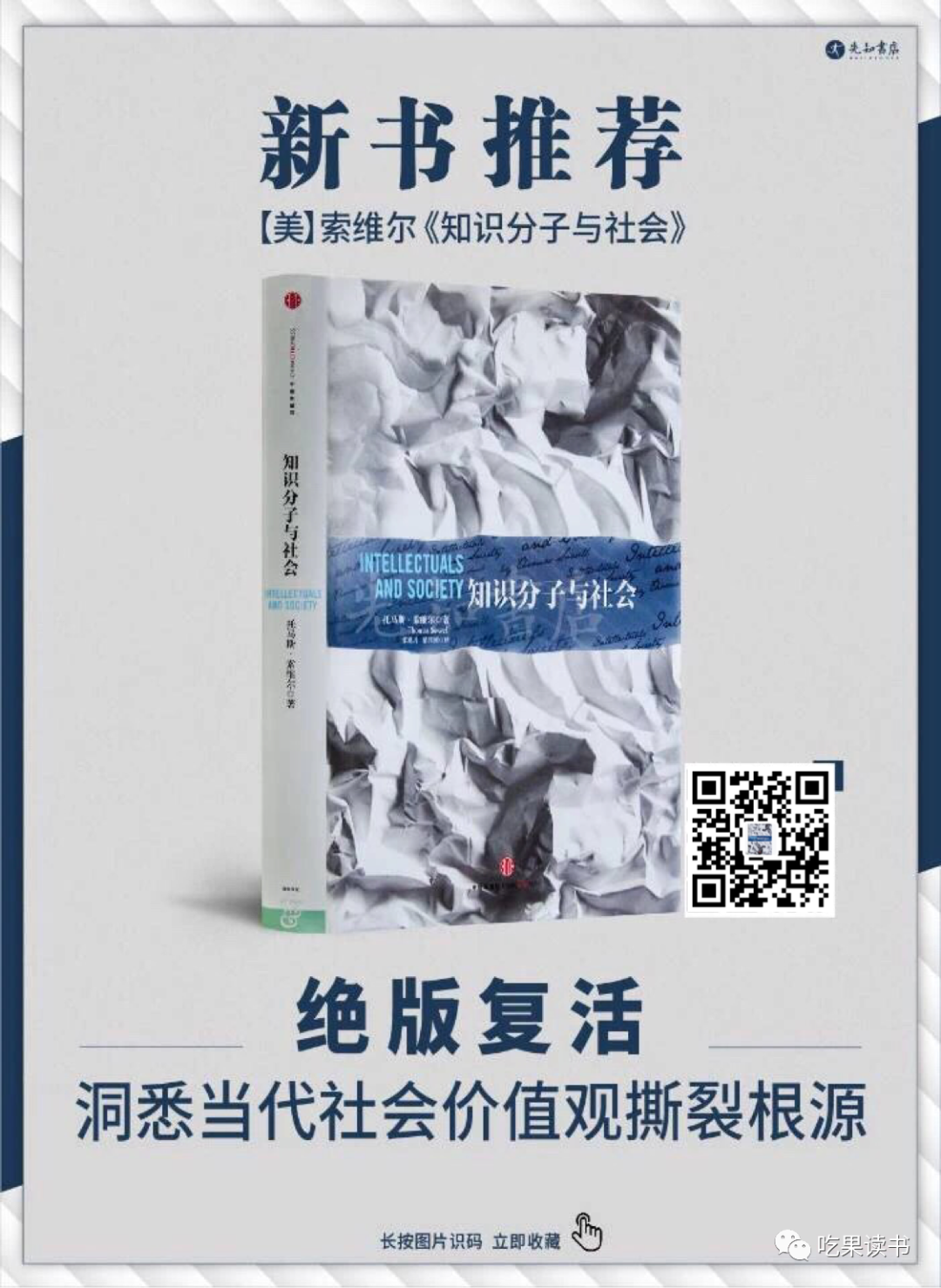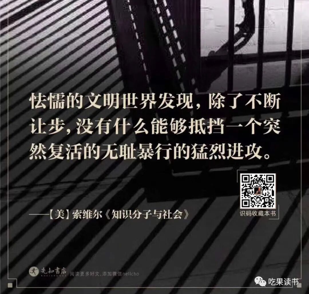 北大教授何怀宏:《知识分子与社会》为我们提供了一面镜子,它指出了知识分子道德责任中重要的另一面,即知识分子不仅要敢尽言责,还要善尽言责,考虑和顾及他们的言论和理念对社会产生的影响和后果。北大教授郑也夫:随着公知在当代中国社会中的出现,美誉与污名并驾同来。若不想盲目地赞誉或诋毁,深入认识这一角色当为必要的前提。故《知识分子与社会》的出版,堪称及时。为此,我们诚挚推荐托马斯·索维尔的《知识分子与社会》。这本书可以说是伪装成甜点的一道健康大餐,流畅的文笔、无懈可击的逻辑、渊博的知识,无论对专业人士还是初学者都是一种享受。本书中译本早已绝版,因价值极大,先知书店特少量复活,感兴趣的读者,可识图扫码,一键收藏,赞赏小编。![]()