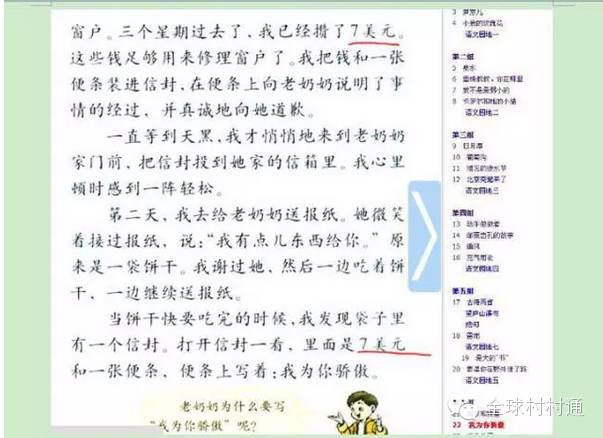 第22课《我为你骄傲》隐藏得极深的一篇弘扬优秀品质的文章,通篇没有人名,让你分不出是中国人还是外国人,但最后,藏不住地卖国情怀就体现在”7美元“这个词上。说7元不行吗?