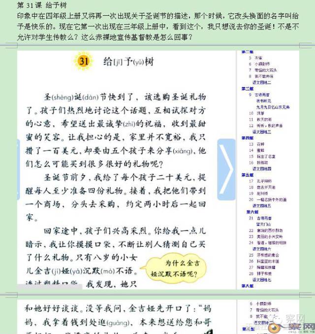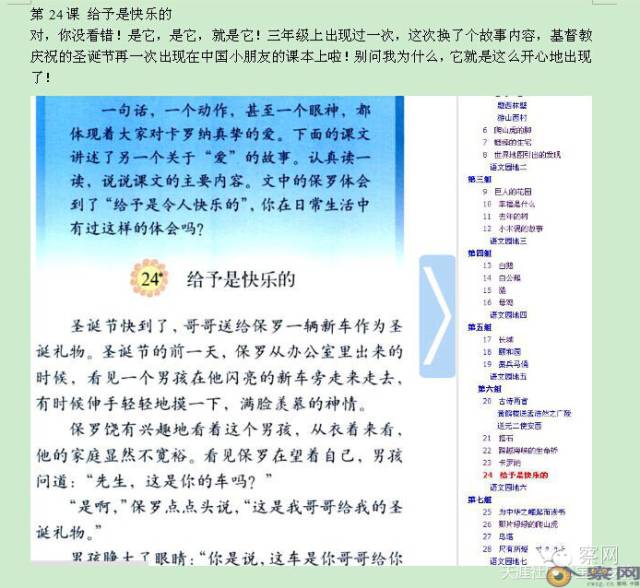第23课 《卡罗纳 》不用问啦,一看名字就知道正宗国外的,来自意大利的作品。对于大量充斥这种二手翻译作品,我实在看不出什么美来。因为它不是一手语言写就的,让小学生这样去体会汉字的美好还是体会国外的美好呢?第24课《给予是快乐的 》对,你没看错!是它,是它,就是它!三年级上出现过一次,这次换了个故事内容,基督教庆祝的圣诞节再一次出现在中国小朋友的课本上啦! 编辑是脑残吗?