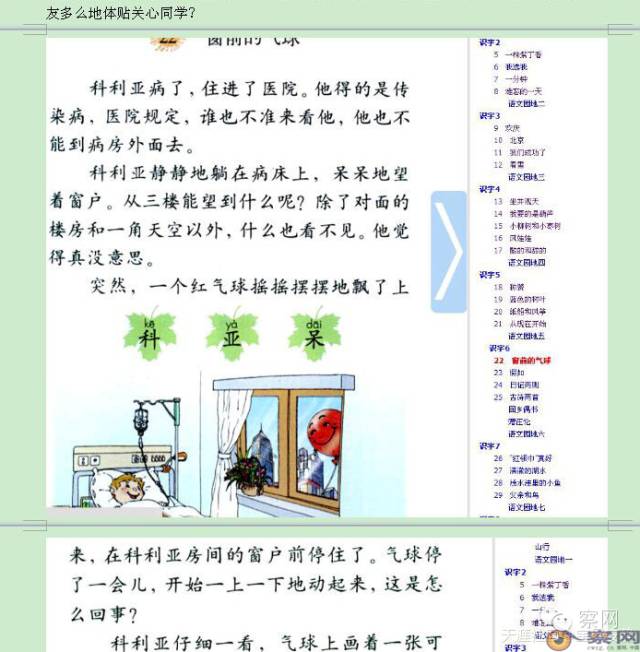 第22课《窗前的气球》描述了因为科利亚生病,关心他的同学来看他,为他升起了气球。