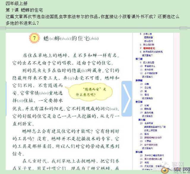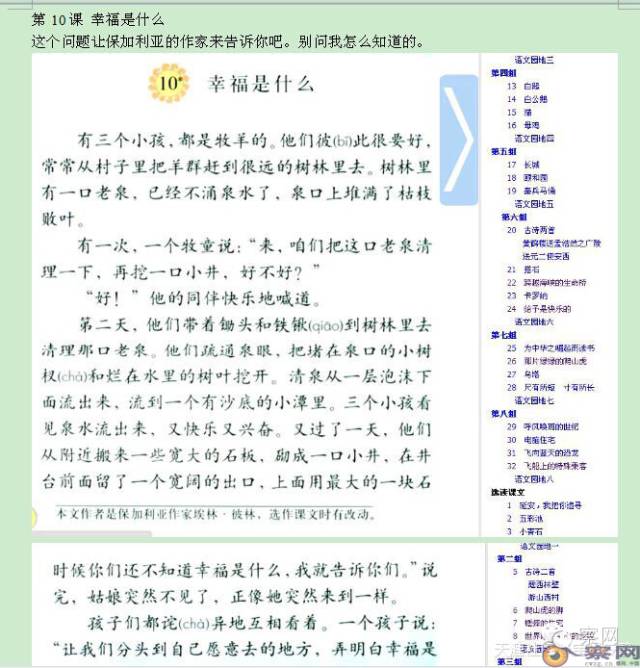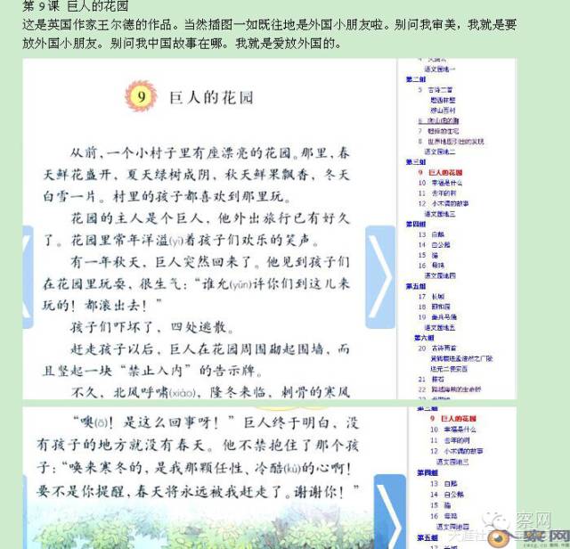 第7课 《手术台就是阵地》说真的,我对白求恩大夫真的非常敬佩,但在这里,他出现在本书倒数第二课选读课本中,可能还因为他有一个外国人的身份吧。至此,三年级课本结束。下面是四年级的课本。注意哟,三年级上出现的《给予树。,在四年级上里改头换面,再一次出现了。它叫给予是快乐的。 第7课 《蟋蟀的住宅 》这篇文章再次节选自法国昆虫学家法布尔的作品。你直接让小孩看课外书不成?还要选这么多他的书进来么?嗯嗯,这个还是人家外国人的细心,和我们中国人无关。第9课 《巨人的花园》这是英国作家王尔德的作品。当然插图一如既往地是外国小朋友啦。别问我审美,我就是要放外国小朋友。别问我中国故事在哪。我就是爱放外国的。第10课 《幸福是什么》这个问题让保加利亚的作家来告诉你吧。别问我怎么知道的。