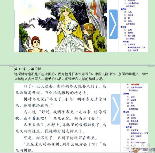 第11课 《去年的树》这棵树肯定不是长在中国的,因为他是日本作家写的,中国人翻译的。别问我学语文,为什么学这么多外国人二道手的作品,问译者和人教的编辑去吧。