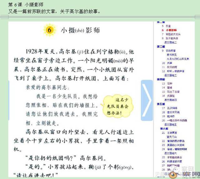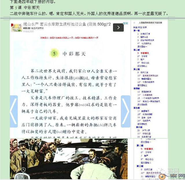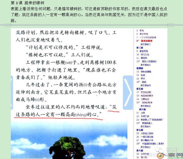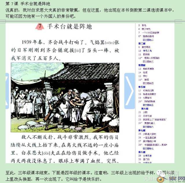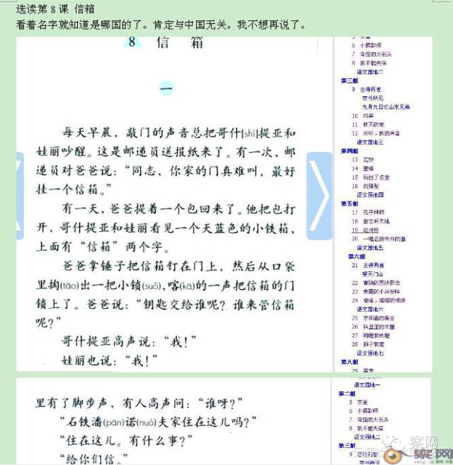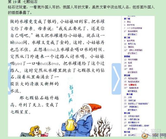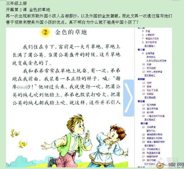 第8课《 路旁的橡树》 表面上看没有任何问题,只是描写橡树的,可这是前苏联的作家写的,然后在课文最后也点了题:筑这条路的人一定有一颗高尚的心。当然这高尚与我国无关,因为这不是中国人筑的路。第14课 《检阅》再一次疯狂大量出现了外国人,中国的三军仪仗检阅这么多,弄不出来?第15课 《争吵 》里面的主人公也全是外国人,从二年级到三年级,短短一年时间,各国际友人纷纷以友好聪明善良的形象在我们课本上冒头了。前苏联的,波兰的,英国的,意大利的,法国的,荷兰的,我看编者大概忘记了八国联军侵华是怎么回事了。第19课 《七颗钻石 》钻石这玩意,一看就外国人写的,俄国人写的文章,虽然文章中没出现人名,但后面外国人的插图暴露了。