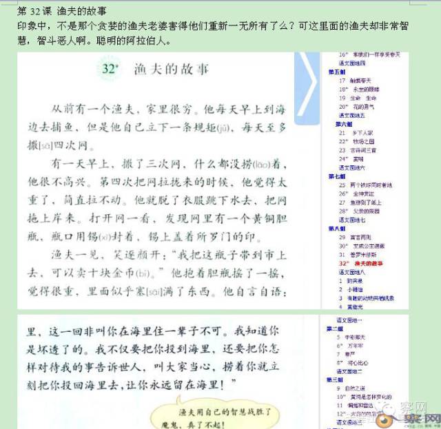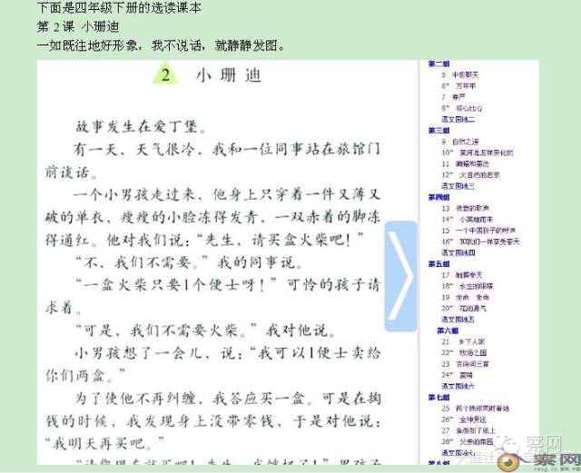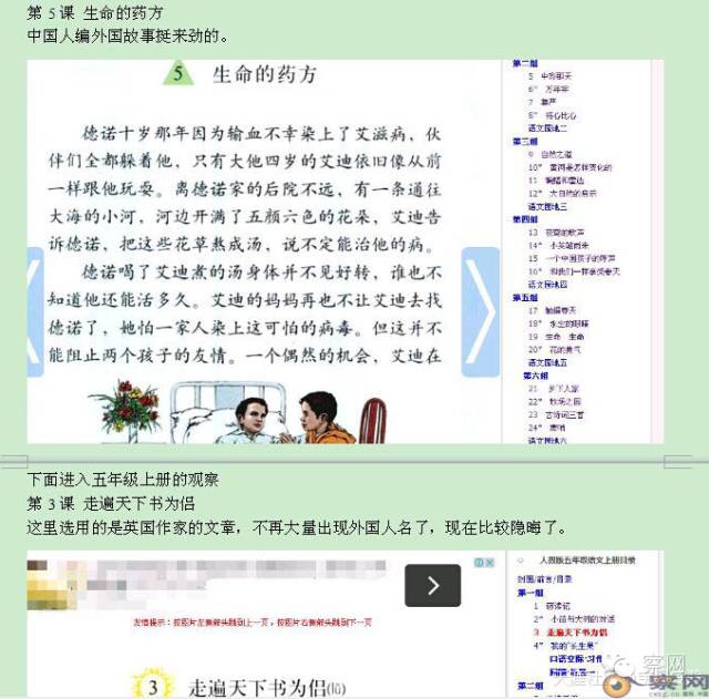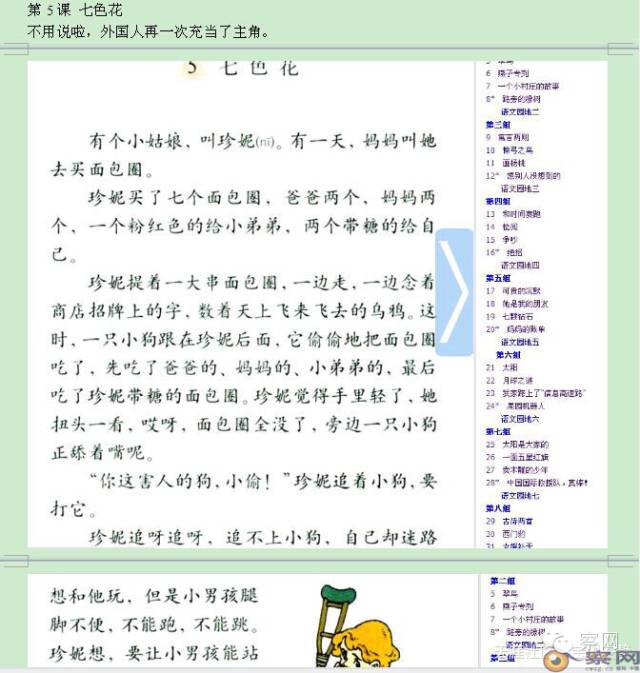 这篇文章出现母亲河黄河了,可是里面公然喊出黄河是一条祸河!!!这是怎么回事?什么乱七八糟的编辑???第18课 《永生的眼睛》美国作家的文章,作品二字我都不想说。翻译来的文章,用来传播思想是可以的,但用来语文学习,难道比我国作家写的水准要高? 第20 课 《花的勇气 》中国作家写的,不过就连写花都要写到国外去,赞美的是维也纳,这编辑真够用心的。第26课 《全神贯注》嗯,外国人的全神贯注。中国人就不会全神贯注啦?第32课 《渔夫的故事 》印象中,不是那个贪婪的渔夫老婆害得他们重新一无所有了么?可这里面的渔夫却非常智慧,智斗恶人啊。聪明的阿拉伯人。第2课 《小珊迪 》一如既往地好形象,我不说话,就静静发图。第5课 《生命的药方 》中国人编外国故事挺来劲的。