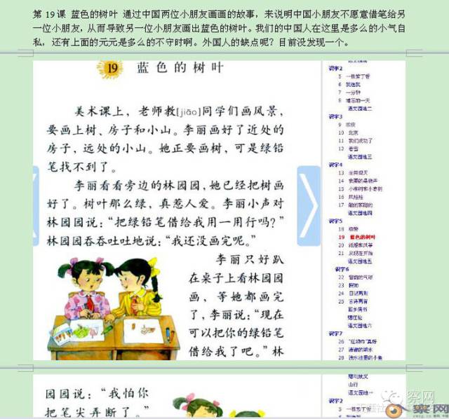 第19课《蓝色的树叶》 提到了现代的中国小朋友,其中一位中国小朋友不愿意借笔给另一位小朋友,导致另一位小朋友画出蓝色的树叶。悄悄地表现了小气自私的中国人形象。