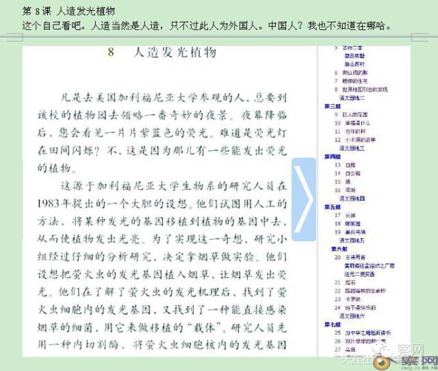 第8课 《人造发光植物》这个自己看吧。人造当然是人造,只不过此人为外国人。中国人?我也不知道在哪哈。第5课 《中彩那天》二战中奔驰车什么的,嗯,肯定和国人无关。外国人的优秀道德品质啊,再一次显露无疑了。第7 课《 尊严》自己看吧,有尊严的当然是外国人。