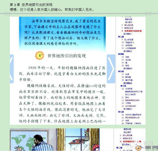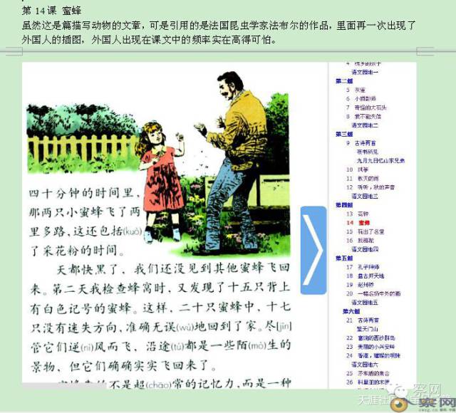 第14课 《蜜蜂》虽然这是篇描写动物的文章,可是引用的是法国昆虫学家法布尔的作品,里面再一次出现了外国人的插图,外国人出现在课文中的频率实在高得可怕。第15课 《玩出了名堂 》玩也能玩出名堂的是一个荷兰人。