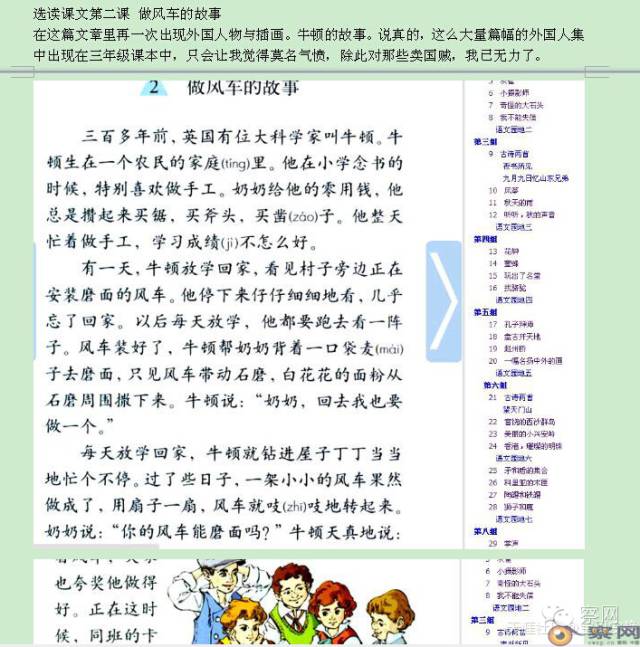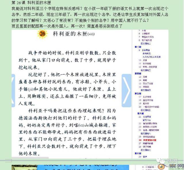 当然我国西北部也是有骆驼的,但此文中没有人名,可是又有外国人的插图。前15课里,就有5课内容全是外国人的形象,各种优点,占了三分之一。简直有些丧心病狂啊!第26课 《科利亚的木匣 》我能说对科利亚三个字现在特别反感吗?在小孩一年级下册的语文书上就第一次出现这个名字,然后二年级,现在三年级了,再一次出现这个名字,这是让学生反复加强对外国人名的学习和了解吗?太恶心了有没有?不能换个别的名字?用中国人就不行了么?而且里面的配图再一次是外国人,再一次!简直是恶劣到极点了我想说的是,没错,这次实验是正宗的中国学生的行为,可是文章中看不到半个对中国学生的描述!只在插图里隐晦地表现了这是中国学生的行为。印象中在四年级上册又将再一次出现关于圣诞节的描述,那个时候,它改头换面的名字叫给予是快乐的。现在它第一次出现在三年级上册中,看到这个,我只想说去你的圣诞!不是不允许对学生传教么?这么赤裸地宣传基督教是怎么回事?你看名字就直接告诉你,这是外国好汉,和中国人无关!多么直白!在这篇文章里再一次出现外国人物与插画。牛顿的故事。说真的,这么大量篇幅的外国人集中出现在三年级课本中,只会让我觉得莫名气愤,除此对那些卖国贼,我已无力了。看着名字就知道是哪国的了。肯定与中国无关。我不想再说了。三年级上结束,大概四十篇的文章,就有十二篇是外国人的,其它也隐约藏在里面,我没有拿出来比较。像描写动物鲸的,就写到北极一个楚奇克海,然后出现人物,自然与我国无关,但鉴于是描写动物,不是特指人,未罗列出来。在本册书里第一篇就是描写燕子的内容,可是在第6课里却再一次出现燕子专列,以为是什么特别的,却原来又是外国高大上们在做好事啊。