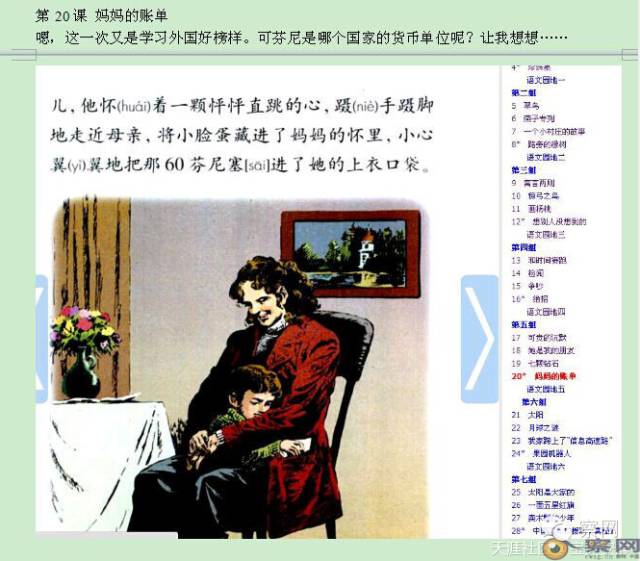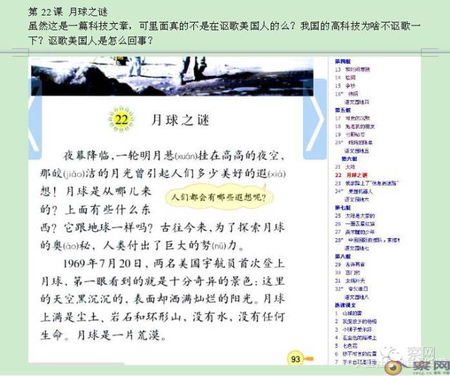 第20课《 妈妈的账单》这一次又是学习外国好榜样。可芬尼是哪个国家的货币单位呢?让我想想……第22课 《月球之谜》虽然这是一篇科技文章,可里面真的不是在讴歌美国人的么?我国的高科技为啥不讴歌一下?讴歌美国人是怎么回事?第27课 《卖木雕的少年》国际友人这算是要写个遍么?欧洲人写完了?开始赞美非洲人了?选读课本 第3课《 小狮子爱尔莎》 嗯,你没看错,就是动物咱都要取个外国名,为啥?因为这是奥地利人写的,国际友人再次出现。看人家爱野生动物,多环保。