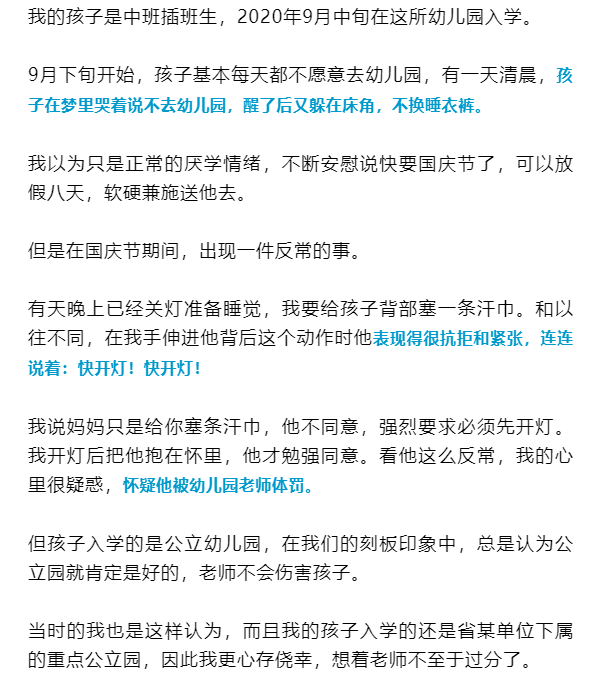 这里我说的是请假,直到11月以后我对孩子说已经退学不用再去这个幼儿园不要害怕,孩子才敢陆陆续续说出更多的事。