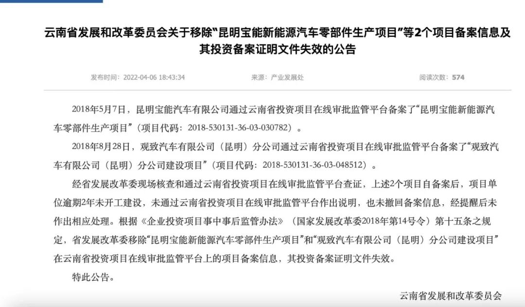 4月6日,云南省发改委发布关于移除“昆明宝能新能源汽车零部件生产项目” 和“观致汽车有限公司(昆明)分公司建设项目”的备案信息及其投资备案证明文件失效的公告。