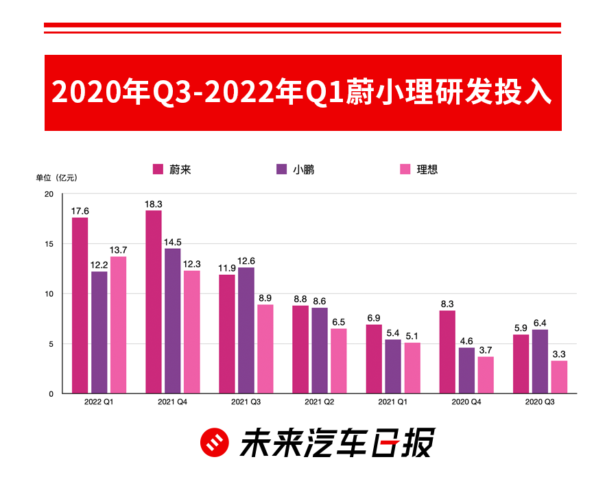 在“蔚小理”中,理想的研发投入占营收比重最低。从2020年第三季度到2022年第一季度,蔚来、小鹏、理想三家的研发投入分别是77.7亿元、64.3亿元和53.5亿元。但近几个季度,理想研发投入的增速均超过三位数。