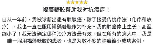 自从一年前,我被诊断出患有胰腺癌,除了接受传统疗法(化疗和放疗),我也一直在服用褐藻糖胶作为补充。我的肿瘤停止生长,甚至缩小了!我无法确定哪种治疗方法最有效,但在我医生的所有病人中,我是唯一服用褐藻糖胶的患者,也是为数不多的肿瘤缩小成功案例。