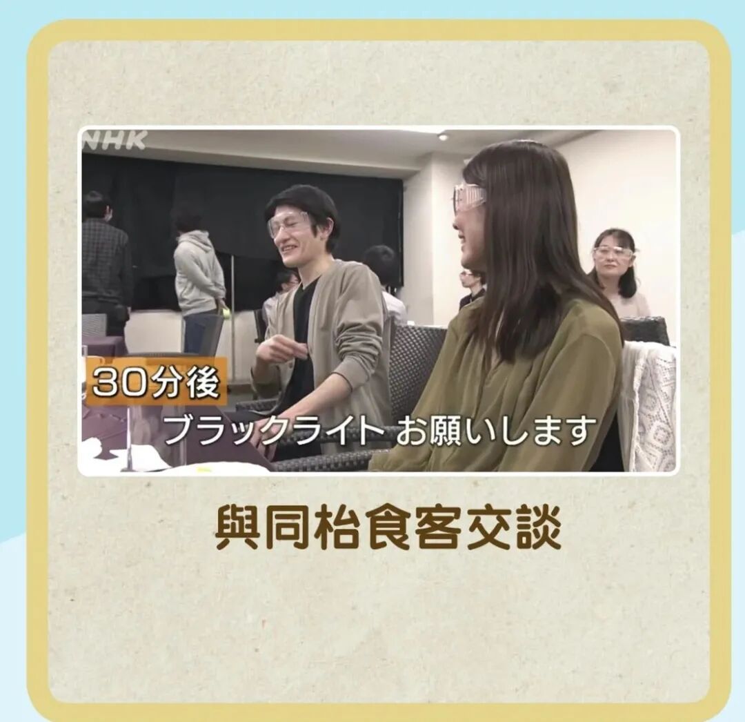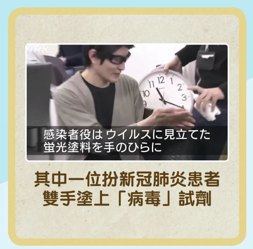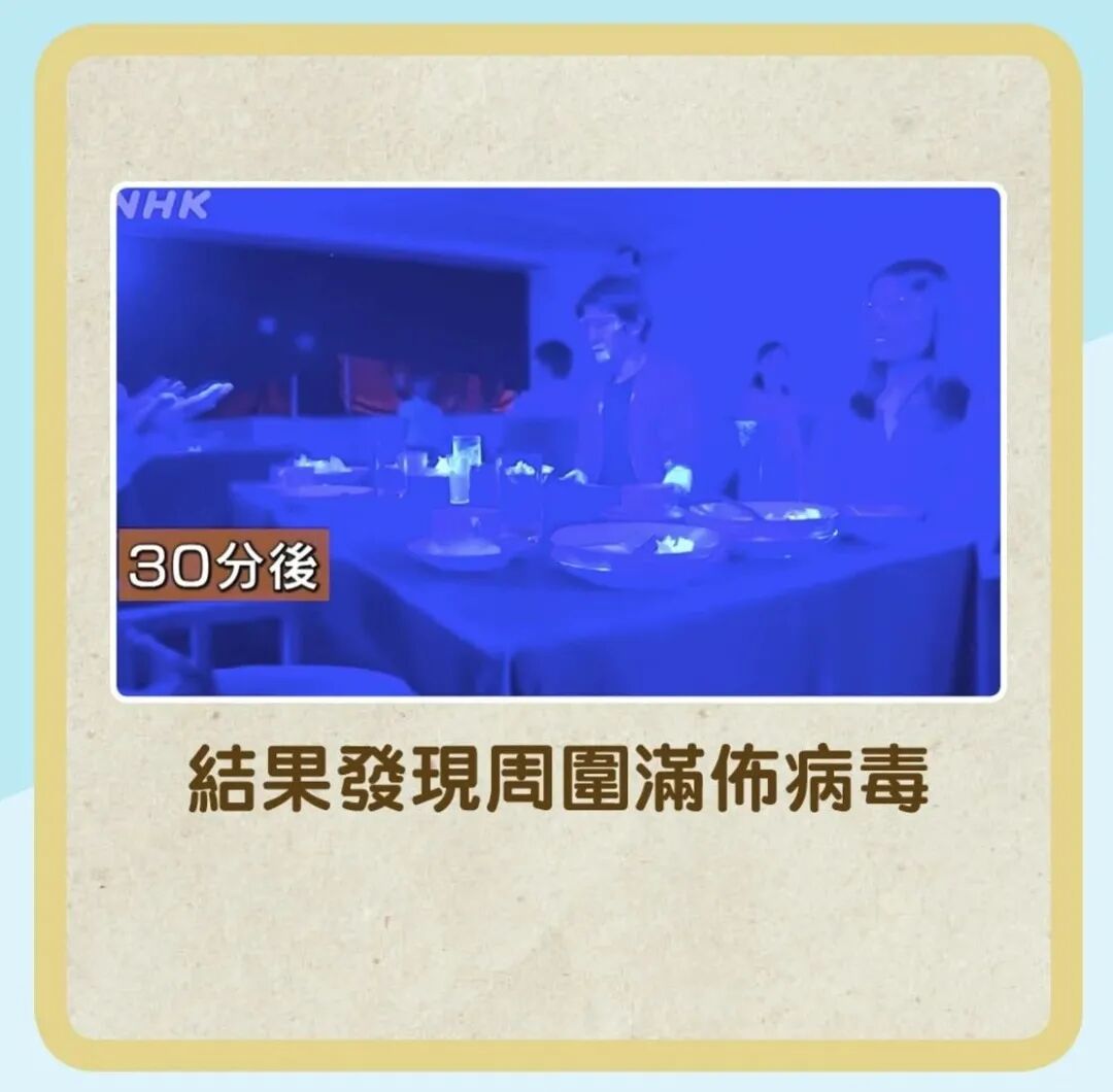 日本《NHK》进行的一项实验,找10个人在餐厅,分别坐4张桌子,并找了其中一位参加者扮演新冠肺炎患者,在他双手涂上实验试剂,以模拟新冠病毒传播情况: