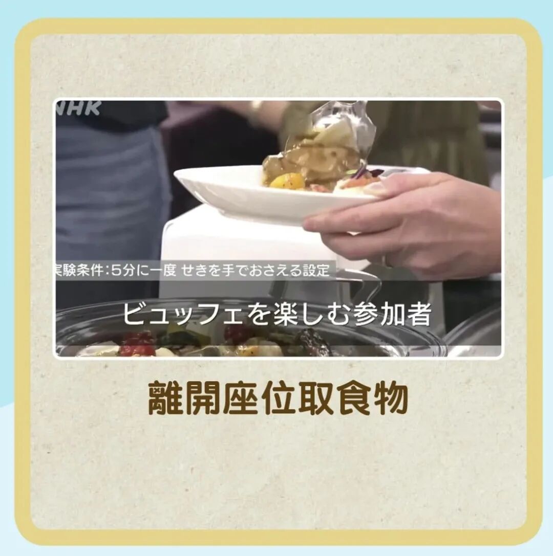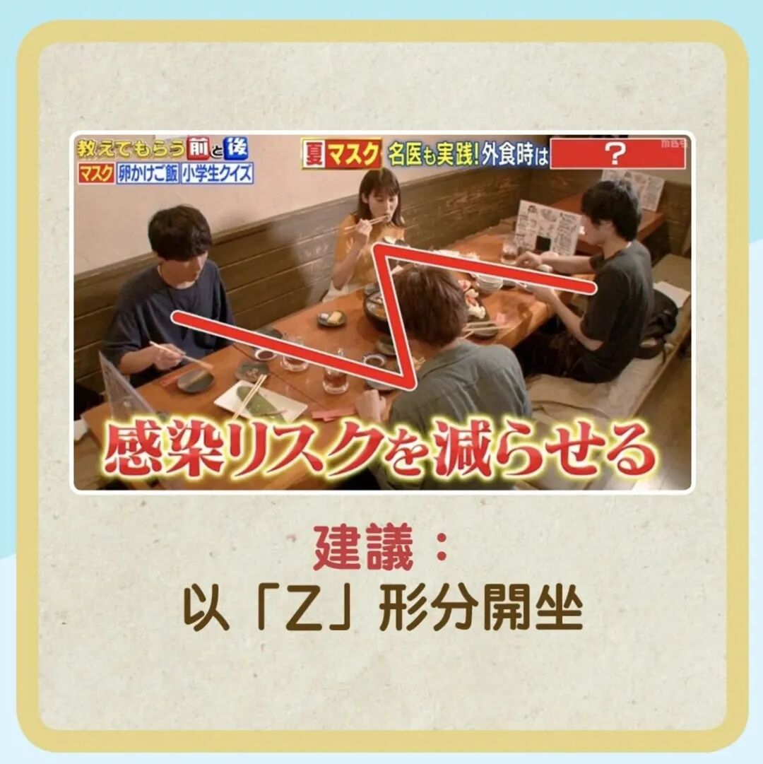 日本节目《教えてもらう前と后》模疑堂食时飞沫扩散的情况,一分钟的交谈已可污染环境至严重水平,提醒大家用膳时须与他人保持距离,节目更提出,可以只坐同一方向,又或若以「Z」形分开,以减低交叉感染或传播病毒的风险