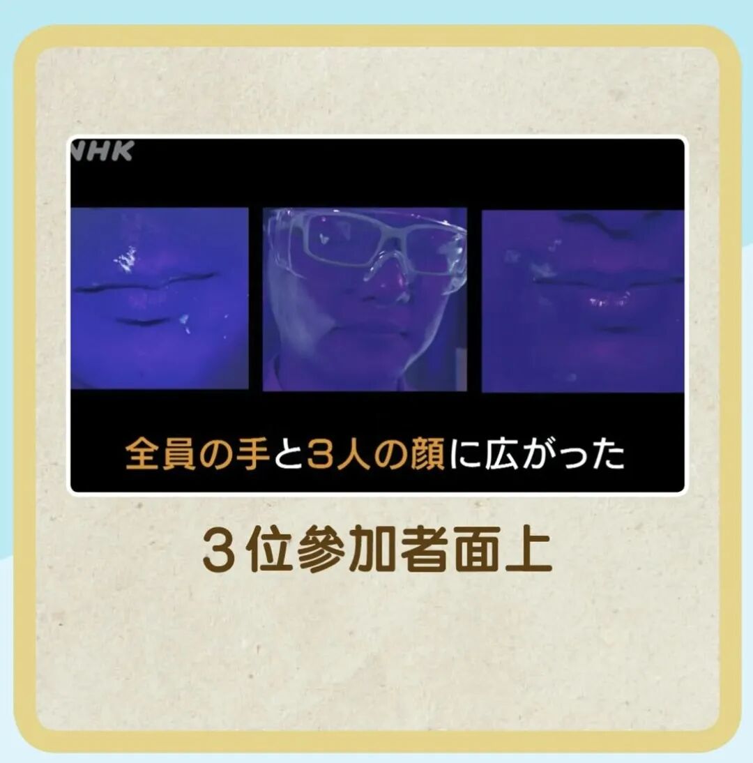 经紫外线一照射后,参加者的手及脸上都已中招,而周围环境也沾有病毒: