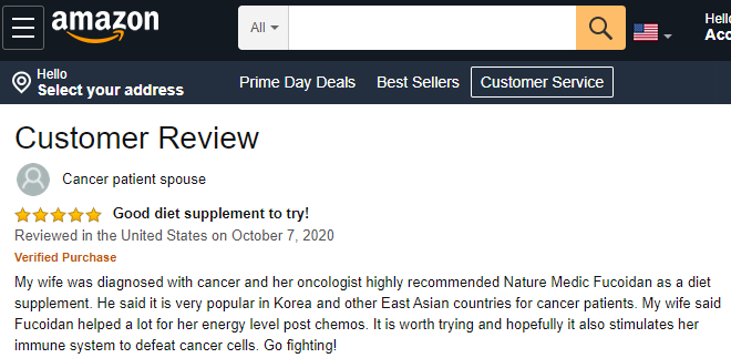 我的妻子被诊断出患有癌症,她的肿瘤医生强烈推荐服用自然醣褐藻糖胶作为保健补充食品。医生说在韩国和其他一些亚洲国家,褐藻糖胶在癌症患者中的使用是非常流行的。我的妻子表示服用自然醣褐藻糖胶在化疗后大大帮助了她的精神。这是非常值得尝试的,希望它可以继续帮助提升她的免疫系统击败癌细胞。加油!
