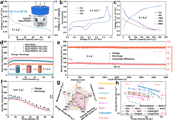 【研究背景】水系锌离子电池凭借成本低、理论容量高、环境友好、安全性高等优点受到广泛关注,但缺乏能够快速、高效、稳定储锌的先进正极材料。因此,开发具有高储锌活性的正极材料是推动水系锌离子电池发展的关键之一。过渡金属二硫化物,特别是MoS2,由于其相对较大且易扩张的层间距以及与二价Zn2+较弱的静电相互作用是很有前景的储锌材料。目前,MoS2基正极材料的改性策略主要聚焦于结构设计(如插层工程、相变工程、缺陷工程),在储能机制方面鲜有提出新见解。近期,质子(H+)被认为是水系锌离子电池中潜在的载流子,具有快速的扩散动力学且能够贡献额外容量。因此,探索质子在MoS2正极中的插层化学同时优化其储锌行为,将水系Zn-MoS2电池性能提升至一个新水平,具有重要意义。 【工作介绍】近日,北京科技大学刘永畅教授和李平教授等研究人员通过剥离-回流方法成功将聚(3,4-乙烯二氧噻吩)嵌入MoS2层间(MoS2/PEDOT),MoS2层间距从0.62 nm显著扩大至1.29 nm,且插层PEDOT能够提升电子导电性、加固层状结构、激活质子插层化学,实现了高效、可逆的H+/Zn2+共插层机制。更有趣的是,共插层H+可以作为“润滑剂”有效屏蔽二价Zn2+与MoS2/PEDOT骨架的静电相互作用,促进Zn2+传输。得益于结构和储能机制的双重优化,该材料表现出极佳的倍率性能(0.1和15 A g−1下可逆容量分别为312.5和83.6 mA h g−1)和出色的长循环稳定性(4000周循环后容量保持率为90.1%)。该研究工作以“Unveiling the “Proton Lubricant” Chemistry in Aqueous Zinc-MoS2 Batteries”为题发表在Angewandte Chemie International Edition。北科大博士研究生李省伟和硕士研究生黄朝为本论文共同第一作者,本工作同时得到南开大学焦丽芳教授,北科大曲选辉教授和高磊副教授的支持。示意图1:水系锌离子电池高性能MoS2正极结构改性和机理优化示意图。 【内容表述】理论计算首先证明PEDOT插层MoS2的可行性。基于理论指导,作者采用剥离-回流方法合成了MoS2/PEDOT纳米片。通过XRD、FTIR、Raman、SEM、HRTEM以及HAADF-TEM对其结构和形貌进行表征,结果表明PEDOT被成功嵌入MoS2层间,层间距从0.62 nm显著拓宽至1.29 nm,且插层PEDOT能够提升电子导电性、加固层状结构。此外,富金属1T相赋予该材料更好的亲水性,有利于电解液充分浸润。图1:a)DFT计算模拟聚合物分子与MoS2在不同结构模型的吸附能;b)理论上最稳定的MoS2/PEDOT结构模型;Bulk MoS2和MoS2/PEDOT的c)XRD图谱,d)FTIR和e)Raman光谱;f)MoS2/PEDOT的SEM图;g)Bulk MoS2的HRTEM图;MoS2/PEDOT的h)HRTEM、i)HAADF-TEM和j)SEM mapping图。 作者进一步通过非原位XRD、FTIR、XPS、Raman、HRTEM、SEM和STEM mapping研究了MoS2/PEDOT电极的储能机理。多种非原位测试充分证明MoS2/PEDOT电极在高电压和低电压区间分别展现Zn2+嵌入/脱出和H+/Zn2+共嵌入/脱出行为。图2:a)0.1 A g−1下MoS2/PEDOT电极的初始充放电曲线;非原位b)XRD、c)Zn 2p XPS、d)FTIR和e)Raman光谱;f)完全放电和g)完全充电状态下的HRTEM图;h)完全放电下的HAADF-TEM图;i)完全放电和j)完全充电状态下的SEM图;k)完全放电和充电状态下的STEM mapping图。 三电极电池证明质子插层发生在0.57-0.25 V vs. Zn2+/Zn电压范围内,首周放电贡献52.7 mA h g−1的容量(0.1 A g−1)。作为水系锌离子电池正极材料,MoS2/PEDOT在50次循环后没有容量衰减(312.5 mA h g−1 at 0.1 A g−1)。此外,MoS2/PEDOT电极即使在15 A g−1的高电流密度下仍可提供83.6 mA h g−1的可逆容量,同时也展示了出色的长循环稳定性(4000周循环后容量保持率为90.1%)。图3:a)三电极电池放电曲线(采用稀H2SO4电解液,pH≈3.4);b)0.1 mV s−1扫速下的CV曲线;c)0.25-1.4 V电压窗口内0.1 A g−1电流密度下的恒电流充放电曲线;d)MoS2/PEDOT和Bulk MoS2的循环性能;e)5 A g−1电流密度下的长循环稳定性;f)倍率性能;g-h)MoS2/PEDOT正极与已报道的过渡金属硫属化物水系锌电正极对比。 作者通过GITT测试评估了MoS2/PEDOT的电极过程动力学,结果表明MoS2/PEDOT电极表现出较高的离子扩散系数,特别是激活质子插层化学后离子扩散动力学明显加快。通过DFT理论计算系统地研究了质子插层和层间距扩大对锌离子扩散行为的影响。Zn2+在MoS2/PEDOT中的扩散能垒远低于Bulk MoS2。此外,H+能够有效屏蔽Zn2+与MoS2/PEDOT之间的静电相互作用,表明H+可以作为“润滑剂”加速锌离子传输。图4:a)MoS2/PEDOT正极材料在0.1 A g−1下的GITT曲线以及对应的扩散系数;b)不同倍率下在不同电压区间内的容量保持率;c)Bulk MoS2、MoS2/PEDOT和H+改性MoS2/PEDOT中的Zn2+迁移行为;d)不同扫速下赝电容行为贡献量;e)2H-MoS2、1T-MoS2和PEDOT的传输本征态分布。 最后,将制备的MoS2/PEDOT正极,PVA/ZnSO4水凝胶电解质和锌箔负极组装准固态纤维状电池,在不同温度和弯折程度下均展示出优异的性能,即使编织到手套中也能够点亮LED灯线,显示出良好的应用潜力。图5:a)准固态纤维状锌离子电池示意图;b)PVA/ZnSO4水凝胶电解质的LSV曲线和EIS曲线(内嵌);c)0.1 mA cm−2电流密度下在PVA/ZnSO4水凝胶电解质中的Zn沉积/剥离行为;d)0.1 A g−1电流密度下准固态电池的循环性能;e)倍率性能;f)不同温度和g)不同弯曲状态下的循环性能;h)点亮LED灯带照片。 【总结】作者结合实验和理论计算证据,成功破译了水系Zn-MoS2电池中的质子插层化学,提出了“质子润滑剂”驱动锌离子传输的新概念,拓宽了Zn-MoS2电池的视野。 此项研究得到了国家自然科学基金(22075016),中央高校基本科研业务费(FRF-TP-20-020A3和QNXM20220060),北科