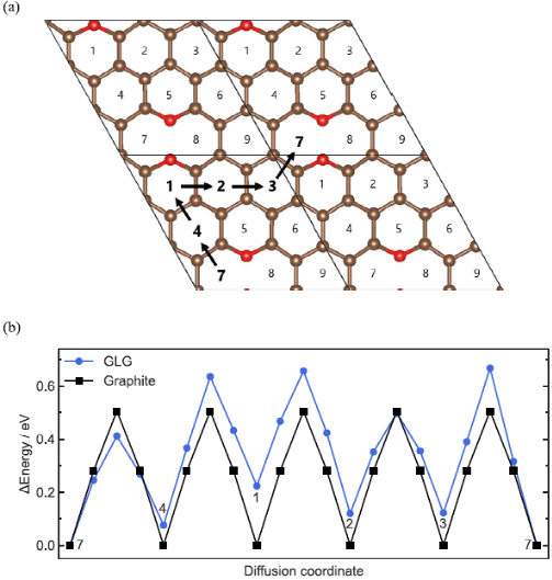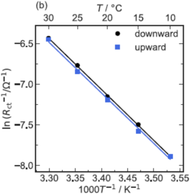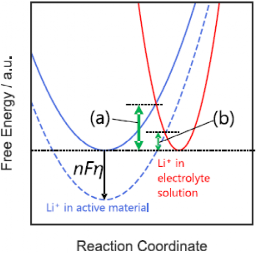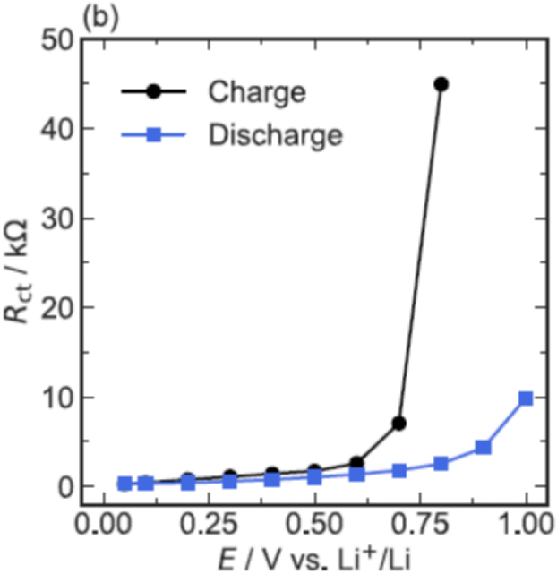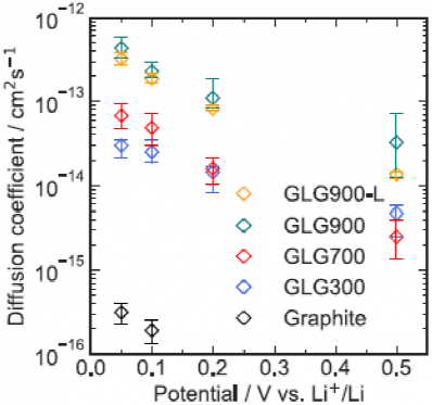 第一作者:Junichi Inamoto通讯作者:Junichi Inamoto通讯单位:日本兵库县立大学 作为一种通过对氧化石墨进行热处理得到的材料,类石墨烯石墨(GLG)具有当电极电势低于Li沉积电势时保持高速充电且不沉积锂金属的优势。然而,影响GLG快速充电能力的因素尚且不清楚。 近日,日本兵库县立大学Junichi Inamoto团队通过电化学阻抗探究影响类石墨烯石墨负极快充能力的因素。研究者通过电化学阻抗法对GLG薄膜的电荷转移电阻和扩散电阻定量评估后发现:GLG/电解质界面处锂离子转移的活化能几乎与报道的石墨相同,但是GLG中的锂离子扩散系数却比石墨高几个数量级;此外,在不同结构参数的GLG比较中,含氧量较低且内部石墨烯层中具有较多气孔的GLG具有较高的锂离子扩散系数。因此可以得出结论,迄今为止报道的GLG的快速充电性能归因于GLG内部锂离子的快速扩散。相关工作以“Insight into the Origin of the Rapid Charging Ability of Graphene-Like Graphite as a Lithium-Ion Battery Anode Material Using Electrochemical Impedance Spectroscopy”为题发表在国际期刊The Journal of Physical Chemistry C上。 【文章详情】模型的建立图1:原始石墨、GO、GLG300、GLG700和GLG900的XRD图谱。(标有*的峰来自用于峰位置校正的硅;GLG300指在300摄氏度下处理的GLG,其他类似) 研究者通过XRD分析证明热处理降低了GLGs的层间距离且降低的层间距,与GO在较高温度下大量含氧基团被去除有关。此外,研究者通过电化学性能分析证明GLG薄膜在结构、表面形貌和电化学性能方面适合作为模型电极。 界面离子转移的影响图2:(a) GLG700薄膜电极在初始充放电循环中的原位EIS图;(b) 首圈充放电期间电荷转移电阻的变化图。图3:(a) GLG700薄膜电极在不同温度下的原位EIS图;(b) 由图a数据得到的阿伦尼乌斯图。(“向下”和“向上”表示温度扫描的方向) 研究者通过对GLG700薄膜电极进行不同电压和不同温度下的EIS分析得出:其层间距离在第一次充电后不可逆地增加,从而降低了电荷转移电阻,这有利于实现GLG的快速充电。另外通过计算得出所有GLG的平均活化能在52-56 kJ mol–1的范围内,这些值与迄今为止报道的石墨活化能保持一致。因此,研究者认为GLG的快速充电特性不能用界面离子转移来解释。 离子扩散的分析图4:石墨和GLGs在0.05、0.1、0.2和0.5 V时的扩散系数。(GLG900-L由在0摄氏度下合成的GO在900摄氏度下进行热处理)图5:(a) 电池中的锂离子位置和扩散路径。(为简单起见,仅显示了GLG模型中带有醚基的底层);(b) 锂离子在GLG(LiC34O2)和石墨(LiC36)中扩散的能垒比较。图6:平衡(实线)和非平衡(虚线)状态下活性材料和电解质中锂离子的摩尔吉布斯自由能曲线比较。 由于GLG高倍率能力的原因不能归因于界面离子转移过程。针对以上情况,研究者着眼于离子扩散过程。研究者通过比较本研究中测得的石墨和GLG的扩散系数,结果证明残余氧气量的减少可能有助于扩散系数的增加。为了研究含氧官能团对锂离子扩散的影响,研究者通过DFT计算来评估GLG中扩散的势垒。研究发现,GLG内部的孔隙数量和低氧含量对锂离子在GLG中的快速扩散具有决定性影响。 快充伴随着大的过电势,当过电势超过一定数值,锂离子的扩散成为唯一的速率决定步骤。并且扩散不仅涉及活性材料中的锂离子扩散,还涉及电解质溶液中的锂离子扩散。因此活性材料内部的扩散速率在快速充电过程中很重要。通过上述结果分析,研究者表明即使在高度优化的实用复合电极中,活性材料内部的锂离子扩散可能是决定快速充电倍率性能的重要因素。 【结果与展望】为了阐明影响GLG优异倍率性能的因素,研究者使用GLG薄膜作为模型电极,通过EIS测量分析了电荷转移电阻和扩散电阻。结果发现,GLG的电荷转移电阻的活化能与石墨相当,表明在GLG/电解质界面的锂离子转移与石墨一样慢。另一方面,GLG内部的锂离子扩散系数比石墨高几个数量级,表明锂离子可以在GLG内部快速扩散。此外,在不同结构参数的GLG比较中,含氧量较低且内部石墨烯层中具有较多气孔的GLG具有较高的锂离子扩散系数。因此可以得出结论,迄今为止报道的GLG的快速充电性能归因于GLG内部锂离子的快速扩散。 Junichi Inamoto, Shinpei Komiyama, Satoshi Uchida et al. Insight into the Origin of the Rapid Charging Ability of Graphene-Like Graphite as a Lithium-Ion Battery Anode Material Using Electrochemical Impedance Spectroscopy. The Journal of Physical Chemistry C.https://doi.org/10.1021/acs.jpcc.2c04780