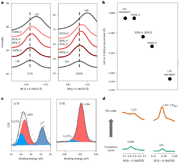 第一作者:Sha Tan通讯作者:胡恩源,曹霞通讯单位:美国布鲁克海文国家实验室,美国西北太平洋国家实验室 准确理解固体电解质界面(SEI)的化学性质,对于开发基于锂金属的高能电池新型电解质至关重要。本文进一步利用这种技术来探索几个重要的科学问题,包括SEI成分的起源和功能,以及它们之间的相互作用和在充放电循环过程中的演变。 第一个问题是关于LiH的形成机制。尽管SEI中LiH的存在已通过使用冷冻电子显微镜,同步辐射,滴定和核磁共振的独立研究所证实,但LiH中的氢来源尚不清楚。同时,电解质中溶剂和水分都被推测为潜在的氢源。在此,本文使用同位素取代结合同步辐射XRD以更准确的方式解决了这一争论。 第二个问题是关于在低浓度电解质(约1 M)中是否可以通过阴离子分解形成LiF。正如以前的工作中所说的那样,LiF通常被认为是有利的SEI成分,其丰度含量有助于更好的的电化学性能。传统上,LiF源自氟化溶剂和阴离子分解,发生在高浓度或局部高浓度电解质(HCE或LHCE)中。如果 LiF在低盐浓度电解质中可以实现阴离子分解的形成,在成本和离子传输方面都具有内在优势。 最后一个问题是电池循环过程中SEI的演变。SEI的动态性质已被报道,并通过电化学和光谱方法进行研究。在此,本文使用开发的独特基于同步辐射工具进行了理解。 【主要内容】在各种负极候选材料中,锂金属(Li) 因其高比容量,低密度和最低的电化学电位而脱颖而出。不幸的是,锂金属电池(LMBs)面临着严重问题。众所周知,SEI在很大程度上决定了LMB的电化学性能,其准确理解对于实现LMB技术至关重要。然而,由于其对空气和辐射源的高度敏感性,包括结晶相和非晶相在内的复杂成分以及痕量样品量,SEI的表征非常具有挑战性。冷冻电子显微镜和滴定气相色谱等几种先进技术已被用于表征SEI 并获得重要见解。此前的研究中,已经开发了一种使用同步辐射X射线衍射(XRD)和对分布函数(PDF)的组合技术分析Li的SEI,并展示了其独特的优势。其中,XRD可以区分结构相似的晶体成分,如LiH和LiF,而PDF可以互补地识别非晶相。 在此,美国布鲁克海文国家实验室胡恩源教授和美国西北太平洋国家实验室曹霞博士等人通过基于同步辐射的X射线衍射和对分布函数分析,揭示了一个更加复杂的SEI形成机制,其电解质,正极,水分和表面天然物质对锂负极的贡献很大,在循环过程中具有高度动态性。同时,使用同位素标记,作者追溯了LiH的来源,如电解质溶剂,水分和原始Li负极上的天然表面物质(LiOH)。当锂非常有限时,如无负极电池,LiOH在循环过程中发展成板状的大晶体。或者,当锂源丰富时,如在Li||NMC811电池中,LiOH与Li反应生成LiH和Li2O。此外,虽然所需的阴离子衍生的富含LiF的SEI通常可以在高浓度电解液或其衍生物中发现,但作者发现它也可以通过交叉效应在低浓度电解液中形成。NMC正极被认为是在低浓度电解质中形成富LiF的SEI的关键因素,通过在NMC正极氧化,然后氟化自由基迁移到负极侧并与Li在负极反应。当使用较高的充电电压在化成循环中加速串扰时,观察到更好的长循环行为,从而强调了SEI形成循环协议的重要性,并为低成本电解液开发开辟了机会。 相关研究成果“Unravelling the convoluted and dynamic interphasial mechanisms on Li metal anodes”为题发表在Nature nanotechnology上。图1. 顶部显示了SEI收集和基于同步辐射的特征的示意图,底部显示了使用基于同步辐射的XRD和PDF技术的优势。图2. LiH氢源的研究。图3. 正极到负极串扰和化成循环协议优化。图4. LiOH的演化途径。 【文献信息】Sha Tan, Ju-Myung Kim, Adam Corrao, Sanjit Ghose, Hui Zhong, Ning Rui, Xuelong Wang, Sanjaya Senanayake, Bryant J. Polzin, Peter Khalifah, Jie Xiao, Jun Liu, Kang Xu, Xiao-Qing Yang, Xia Cao, Enyuan Hu, Unravelling the convoluted and dynamic interphasial mechanisms on Li metal anodes, 2022,Nature nanotechnology. https://doi.org/10.1038/s41565-022-01273-3