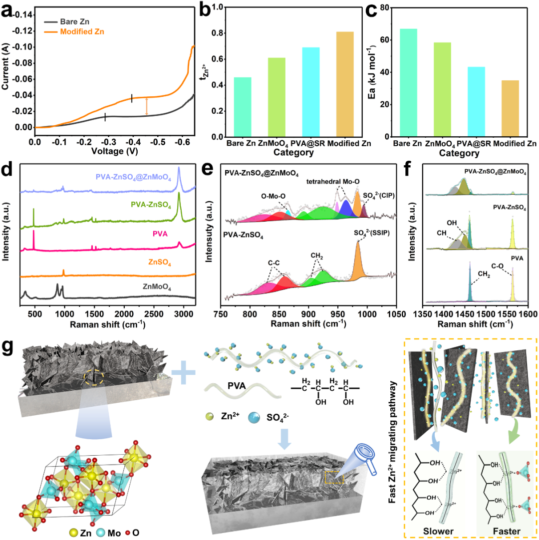 图3. 类SEI结构修饰层快速Zn2+传输能力的探究。(a) 极限扩散电流测试,(b) Zn2+迁移数;(c) 锌负极电极反应活化能;(d-f) Raman光谱;(g) Zn2+在混合内层的ZnMoO4/PVA界面快速迁移示意图。