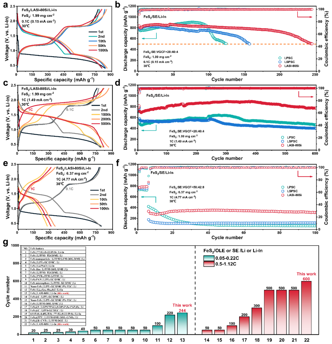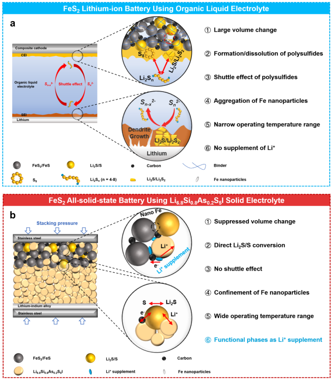 【工作介绍】中科院物理所吴凡团队与北京字节跳动公司合作,提出一种新型超快锂离子导体Li6.8Si0.8As0.2S5I(LASI-80Si,)与商业化的FeS2正极组合的全固态电池构型,除了完全消除FeS2的穿梭效应和抑制其体积变化之外,由于LASI-80Si相对较低的活化能(0.2eV)和优异的FeS2/LASI-80Si界面稳定性,使用LASI-80Si的FeS2 全固态电池相比FeS2 液态锂离子电池具有更宽的工作温度范围(-60℃~60℃),首次实现了能够承受极低探测温度(-60℃)的全固电池。此外,还研究了Li2S和LiI功能相提供额外容量,以及显著增强的锂离子扩散系数/赝电容贡献和电极反应动力学。LASI-80Si电解质具有的独特性质最终保证了FeS2 全固态电池的长循环寿命(在0.1C下244次循环,在1C下600次循环)、优异的倍率性能(20C)、高面负载(13.37 mg cm-2)和高面容量(9.05 mAh cm-2)。这些结果表明,LASI-80Si 固态电解质和FeS2正极组合在宽温域和大容量全固态电池的实际应用中具有巨大潜力。该成果以“Wide-temperature, Long-cycling, and High-loading Pyrite All-solid-state Batteries Enabled by Argyrodite Thioarsenate Superionic Conductor”为题发表在国际知名期刊Advanced Functional Materials (IF=19.924), https://doi.org/ 10.1002/adfm.202211211,第一作者为中国科学院物理研究所博士生卢普顺。 【核心内容】1. 超离子导体LASI-80Si与黄铁矿FeS2正极组合的全固态电池的优点传统氧化物正极材料的容量有限,且过度依赖昂贵的过渡金属元素(如Co和Ni),这使得黄铁矿FeS2成为一种有吸引力的正极。因为黄铁矿FeS2是一种天然丰富的矿物和四电子转移体系,因此成本极低,且比容量翻了四倍(894 mAh g-1)。然而,以下六个关键问题(图1)导致FeS2的可逆转化化学性能较差,从而阻碍了FeS2二次锂离子电池的应用。(1)锂化/脱锂过程中的大体积变化(约160%)会导致活性颗粒的粉碎、电接触损失以及新暴露的表面与有机液体电解质(OLEs)之间的副反应加剧,从而导致容量快速衰减。(2) 由于能量上有利的固-液-固转变,单质硫(即S8)更倾向于转化为多硫化物Li2Sn(n=4~8),其可溶解于OLEs,甚至与导电网络分离,导致电活性物质的损失。(3)穿梭效应导致锂阳极腐蚀、自放电和低库仑效率。具体而言,在正极侧溶解的高阶多硫化物Li2Sn扩散到阳极侧并与锂金属反应,随后生成的低阶多硫化物Li2Sn-x(x=1~4)返回正极侧,并在充电过程中重新转变为高阶多硫化物Li2Sn。此外,不溶性产物Li2S2和Li2S转化为“死硫”,并在阳极侧持续堆积,降低了库仑效率,并使反应动力学恶化。(4)完全还原的产物Fe0纳米颗粒的团聚进一步降低了活性材料的利用率。在没有团聚的情况下,具有大表面积和高反应性的Fe0纳米颗粒均匀分布,并在绝缘Li2S基质中提供电子传输路径,从而促进Li2S/S转化。(5)FeS2 LIBs的工作温度范围很窄。即使在中等温度(例如60℃)下,OLE与高活性Fe0纳米颗粒或由大体积变化产生的新暴露表面之间的副反应也会变得更加强烈,导致容量衰减更快。(6) 尽管锂阳极可以在放电期间提供过量的Li+,但由于在无锂正极处不存在额外的Li+补充,因此在充电期间由于Li +的消耗和捕获以及缓慢的反应动力学引起的容量退化仍然是不可避免的。 幸运的是,通过采用全固态电池配置,特别是LASI-80Si硫化物固态电解质,可以全面解决或减轻这些挑战。(1) 当施加恒定的堆叠压力以保持全固态电池中良好的“固-固”接触时,可以抑制体积变化。此外,在某种程度上,应变/应力也可由延性硫化物固态电解质调节。(2) 由于一步Li2S/S固-固转化,对应于单电压平台,避免了多硫化物的形成和溶解。(3)避免了穿梭效应,由于没有多硫化物产生,所以不存在多硫化物的溶解/扩散。(4)基于全固态电池结构,Fe0纳米颗粒被很好地限制并分布在固体基质中。(5)由于LASI-80Si硫化物固态电解质具有优异的热稳定性和较低的活化能,FeS2 全固态电池具有较宽的工作温度范围。(6) 利用新型独特的LASI-80Si硫化物固态电解质,功能相Li2S和LiI可以提供额外的容量,这些功能相是在材料合成(图S3)和电池循环过程中由LASI-80Si的轻微分解产生的。这些作为Li+补充的功能相可以在一定程度上补偿电极中捕获的Li+和固态电解质I中消耗的Li+,从而延长循环寿命。此外,使用LiI作为界面Li离子传导桥,可以促进从绝缘活性物质(例如Li2S和S)到快离子导体LASI-80Si的Li离子传导。因此,FeS2与LASI-80Si在全固态电池中的结合是有前景的。图1 | 超离子导体LASI-80Si与黄铁矿FeS2正极组合的全固态电池的优点。(a)使用有机液体电解液的传统FeS2锂离子电池存在6个关键问题,导致其电化学性能极差。(b)采用LASI-80Si硫化物固态电解质的FeS2全固态电池有效克服了传统FeS2锂离子电池所面临的挑战,具有优异的电化学性能。 2. 界面稳定性的理论评价界面稳定性或界面形成/演变将显著影响全固态电池的界面阻抗和整体性能。界面稳定性问题涉及固态电解质的电化学分解(还原和氧化)、固态电解质和电极之间的化学反应以及固态电解质-电极界面处的电化学反应。然而,许多研究集中在氧化物正极和硫化物固态电解质的界面稳定性上,金属硫化物正极和硫化物固态电解质的界面稳定性研究较少。基于第一性原理计算,本工作专门研究了硫化物固态电解质(即Li6PS5Cl(LPSC)、Li9.5Si1.5P1.5S11Cl(LSPSC)、Li6.75Si0.75As0.25S5I(LASI-75Si))和FeS2正极之间的界面稳定性。应当注意,计算所采用的超晶胞构型(Li9.5Si1.5P1.5S11Cl和Li6.75Si0.75As0.25S5I)和实验对象(即,Li9.54S