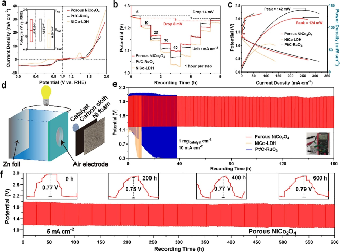 如图,NiCo2O4 在水系锌-空电池也表现出极佳的稳定性 (在5 mA cm-2电流密度下,能够稳定循环运行600 小时),倍率测试亦无明显性能下降。此外,使用NiCo2O4组装的准固态锌-空软包电池也具有较好的电化学性能,展示了其较好的应用前景。