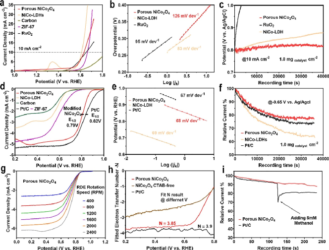 图2. (a-f) 在0.1 M KOH中OER及ORR电化学催化性能,(g,h)不同转速下的性能及电子转移数,(i)抗甲醇测试。