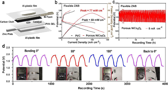 图4. 准固态锌-空软包电池: (a) 电池结构示意图,(b)极化曲线以及功率密度曲线, (c) 在5 mA cm-2电流密度下的恒流充放电稳定性,(d)柔性弯折性能测试。