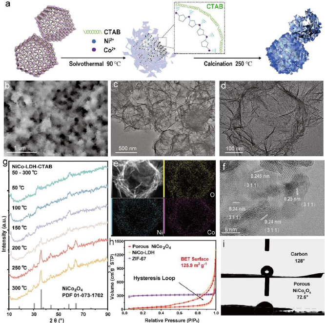 本图展示了空心多孔NiCo2O4 的合成及表征,通过SEM,TEM,XRD,EDS Mapping 确定了其结构及组分,升温XRD显示尖晶石相的形成过程,BET及接触角测试表明其高比表面积和适度的亲水性。