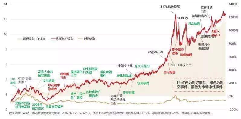 我们以2007年之前上市的1363家公司为样本,通过ROE和净利增速指标筛选出31家上市公司作为优质核心股票资产组合。按初始时等权重持仓并长期持有,则2007-2017年期间收益率高达1164%,年化达25.94%,远高于上证综指。而在这十年中,无论境内外市场的消息及政策,利空远远多于利多。如果你的投资是以交易博弈为出发点的,这些事件一定会干扰你的情绪而频繁的交易。