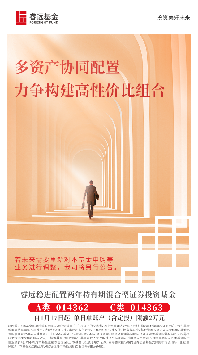 根据1月14日管理人发布的公告,自1月17日起,睿远稳进配置两年持有混合基金(A类份额:014362;C类份额:014363)开放日常申购、定期定额投资及限制大额申购业务。