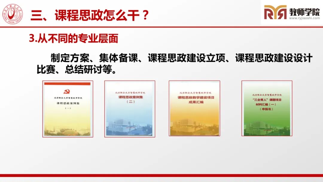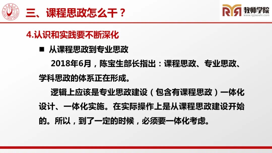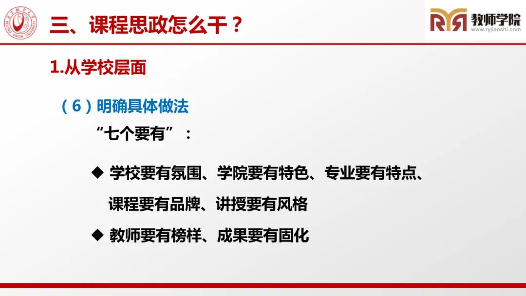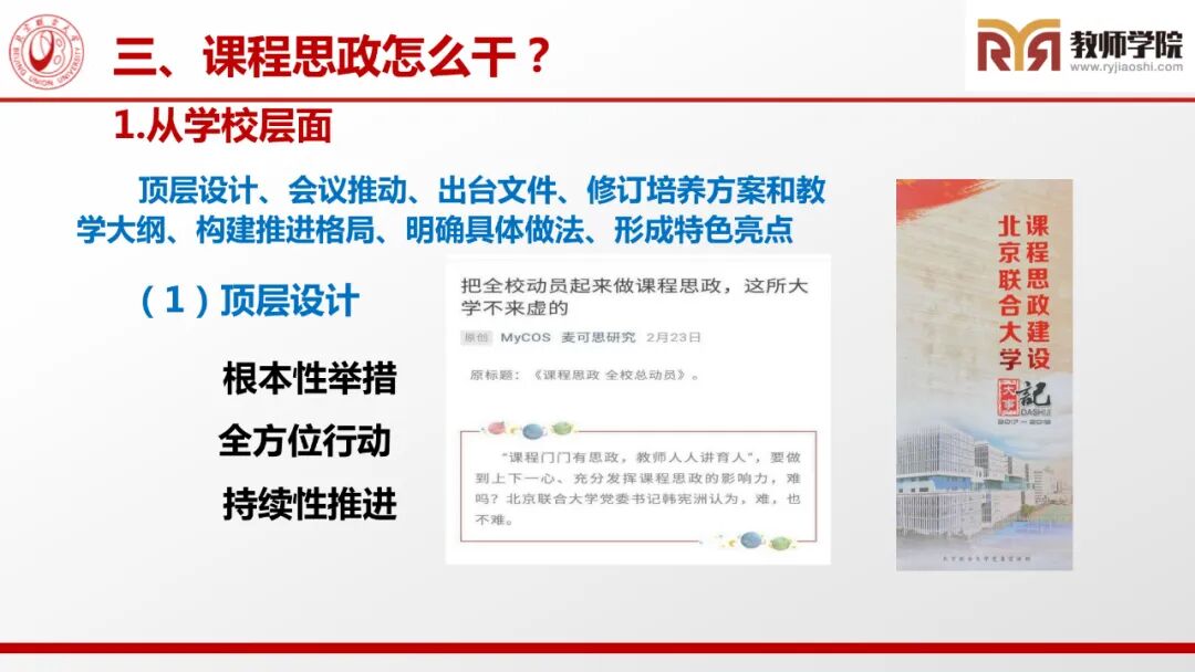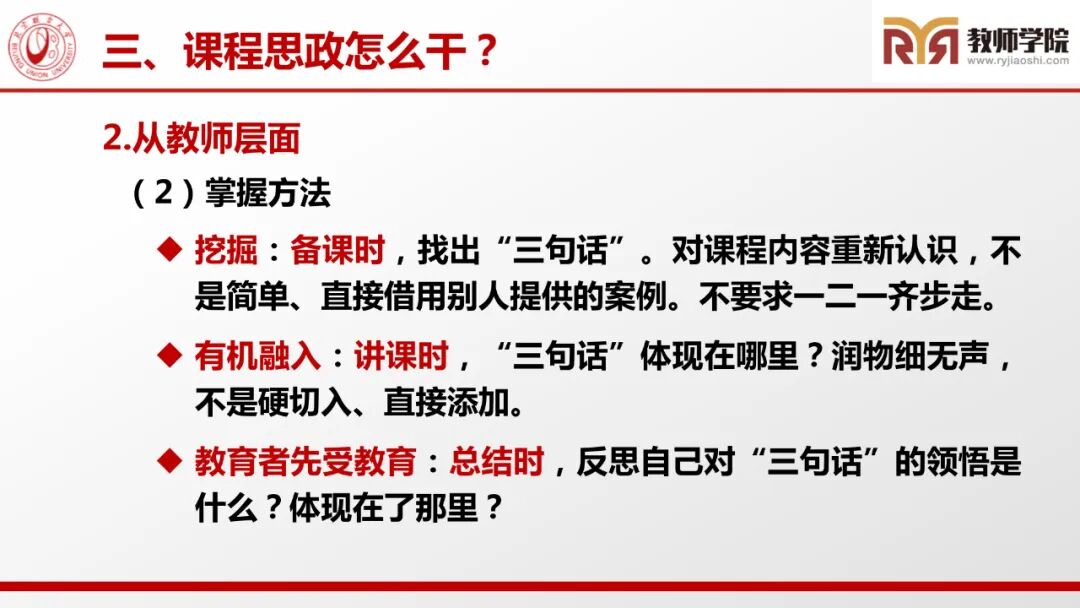 仲计水老师从多角度向超过1500位教师分享了课程思政的理论思考与实践探索,包括“为什么”“是什么”“怎么干”“怎么看”,让教师们对课程思政有了更全面深入的认识。在最受关注的“课程思政怎么干”模块,仲老师分别从学校层面、教师层面以及不同专业层面给出了实践指导,并指出“认识和实践需要不断深化”。以下是仲老师直播课中“课程思政怎么干?”PPT内容分享,欢迎各院校教师学习和参考!
