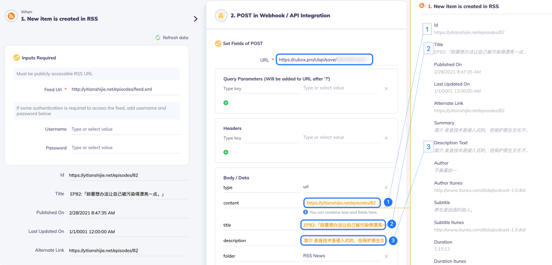 2. 填写 RSS 订阅源链接;继续编辑,在步骤2 Set Fields of POST > URL 一栏中粘贴已准备的 Cubox API 链接;在下方的 Body / Data 一栏中,按照以下设置: