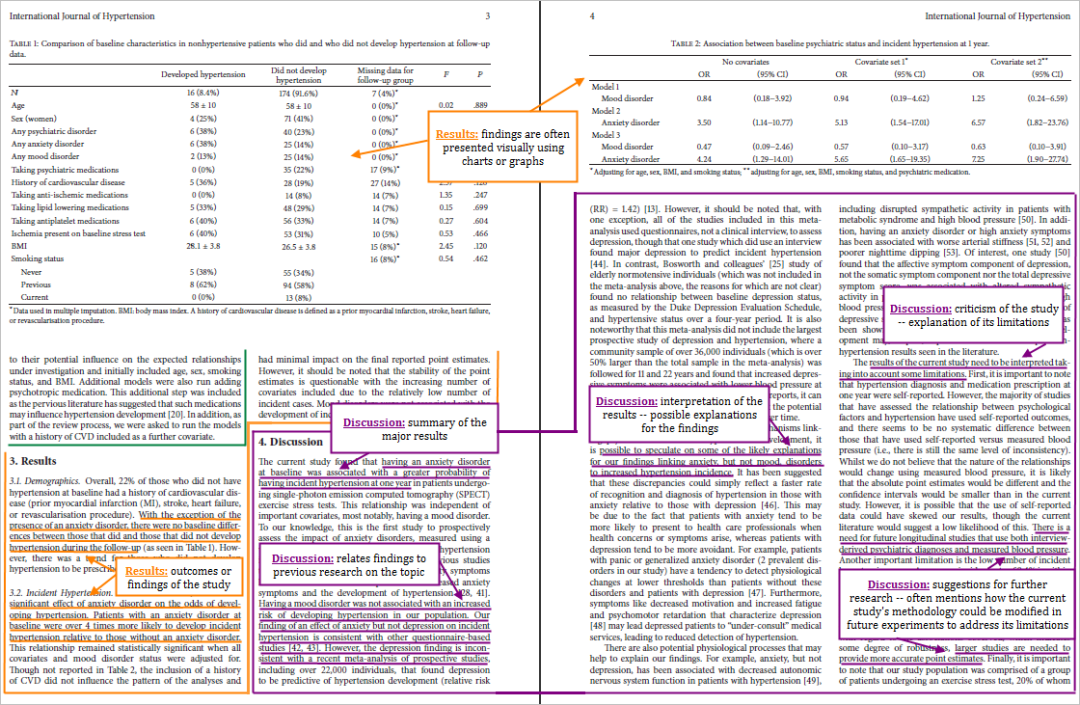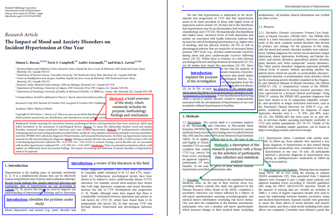 一篇研究论文主要内容是描述了文章作者进行的研究。它解释了研究的方法,如如何收集和分析数据,并阐明了结果的含义。研究的每一步都有详细的报告,以便其他研究人员可以重复实验。 要确定一篇论文是否是一篇研究性文章,请检查其措辞。研究论文中应该包含了描述研究人员在实验过程中所采取的行动的文字。比如可以看到“we tested”、“I measured”或“we investigated”之类的语句。 研究论文除了研究过程中的实验说明,也描述了研究的结果。所以检查论文是否有“the study found”或“the results indicate”之类的短语。接下来,仔细查看文章的格式。研究论文按特定的顺序分为:abstract, introduction, methods, results, discussion, and references(摘要、引言/介绍、方法、结果、讨论和参考文献)。 让我们仔细看看以下这篇作者为Bacon等人的研究论文(Bacon S L , Campbell T S , Arsenault, André, et al. The Impact of Mood and Anxiety Disorders on Incident Hypertension at One Year[J]. International Journal of Hypertension, 2014, 2014:953094.),该文发表于International Journal of Hypertension: (点击图片,可放大查看)