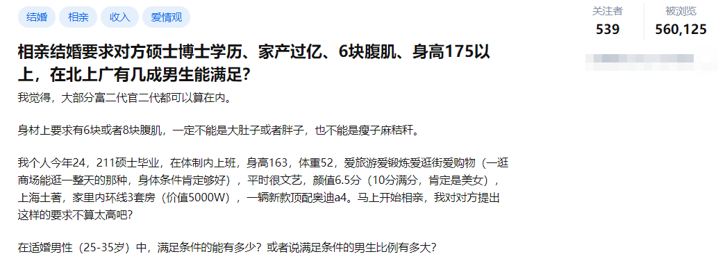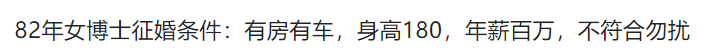 王某表示,他们推荐的相亲对象, 一是学历不太匹配,二是年龄偏大。他填写的年龄范围是22-26岁,后来找的全都是26岁的,“卡在我要求的边上”。婚介公司认为这么做没有问题,他强调说:“我不太喜欢年龄比我大的,我之后要求给我推荐比我小的。”有网友指出,主观上说,王某想找的女孩子不是不存在,而是不会在他找对象的地方,像这样高学历,还要比自己小,这就意味着大学刚刚毕业,为什么要来婚介公司相亲呢?因此,小王的经历非但没有引起大家的同情,反而遭致了广泛的吐槽:无独有偶,近期知乎上有这样一则话题 “重庆 32 岁美女学霸多次相亲未成功引发热议,如何看待此事件?相亲为何这么难?” 引发热议。经媒体报道这名硕士的情况:沈某,目前在一家生物医药公司工作,年薪20万。事业上独当一面,感情却几乎一片空白。她希望找到一个和自己收入、学历相当,年龄上下5岁以内、性格开朗的男士。目前相亲参加了不少,可始终没有遇到合适的人。不少人感叹这样的要求很合理,为什么相亲还是不成功呢?网友表示:可能有一种情况,你以为的相亲要求,可能只是够到了对方的门槛,后续大概率会有一系列的要求,更具自己的相亲经验,见过很多相亲对象都以不同方式“无疾而终”了。此外,不少社交媒体上可以见到一些令人“大开眼界”的相亲要求:——题主个人条件:今年24,211硕士毕业,在体制内上班,身高163, 体重52,爱旅游爱锻炼爱逛街爱购物, 平时很文艺,颜值6.5分,上海土著, 家里内环线3套房(价值5000W),一辆新款顶配奥迪a4。相亲结婚要求对方硕士博士学历、家产过亿、6块腹肌、身高175以上。她觉得,大部分富二代官二代都可以算在内。提问:满足条件的能有多少?或者说满足条件的男生比例有多大?——历史硕士研究生张某,今年32岁,是一名博物馆的工作人员。在谈到自己对女方的要求时,他提出与自己相亲的女孩必须要是本科以上学历、比自己要小、要瘦、身材要高、必须在163以上,少一厘米都不行,163是底线了……近几年,随着硕博人群的扩大,硕博人群恋爱难这个问题越来越被社会所关注。追溯到2014年,一场硕博相亲会在中南财经政法大学附近举行,400名硕士和博士前来寻缘觅爱。现场一名博士生表示,“找一个合适的结婚对象,比考博士难多了!”中南财经政法大学的硕士小李感叹,谈恋爱跟做科研项目不同,不是自己制定一个目标,想好了方法和途径,就一定能按照自己设想的轨迹到达终点。他告诉记者,之前谈过几个女朋友,他都是作为未来的结婚对象去相处的,按照自己设定的时间安排约会,逛街、吃饭,但没多久,对方就从他的恋爱轨道里退出了。