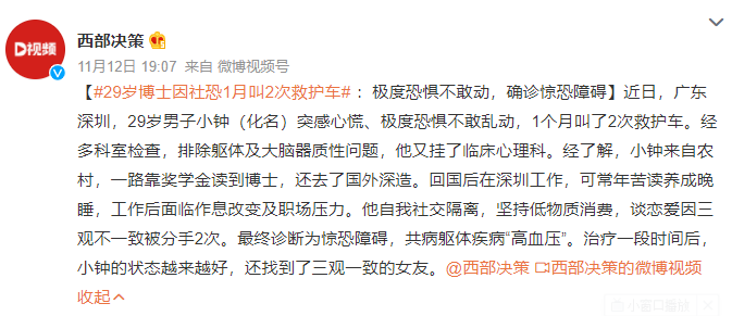 近日,“29岁博士因社恐1月叫2次救护车” 的话题冲上微博热搜第一: