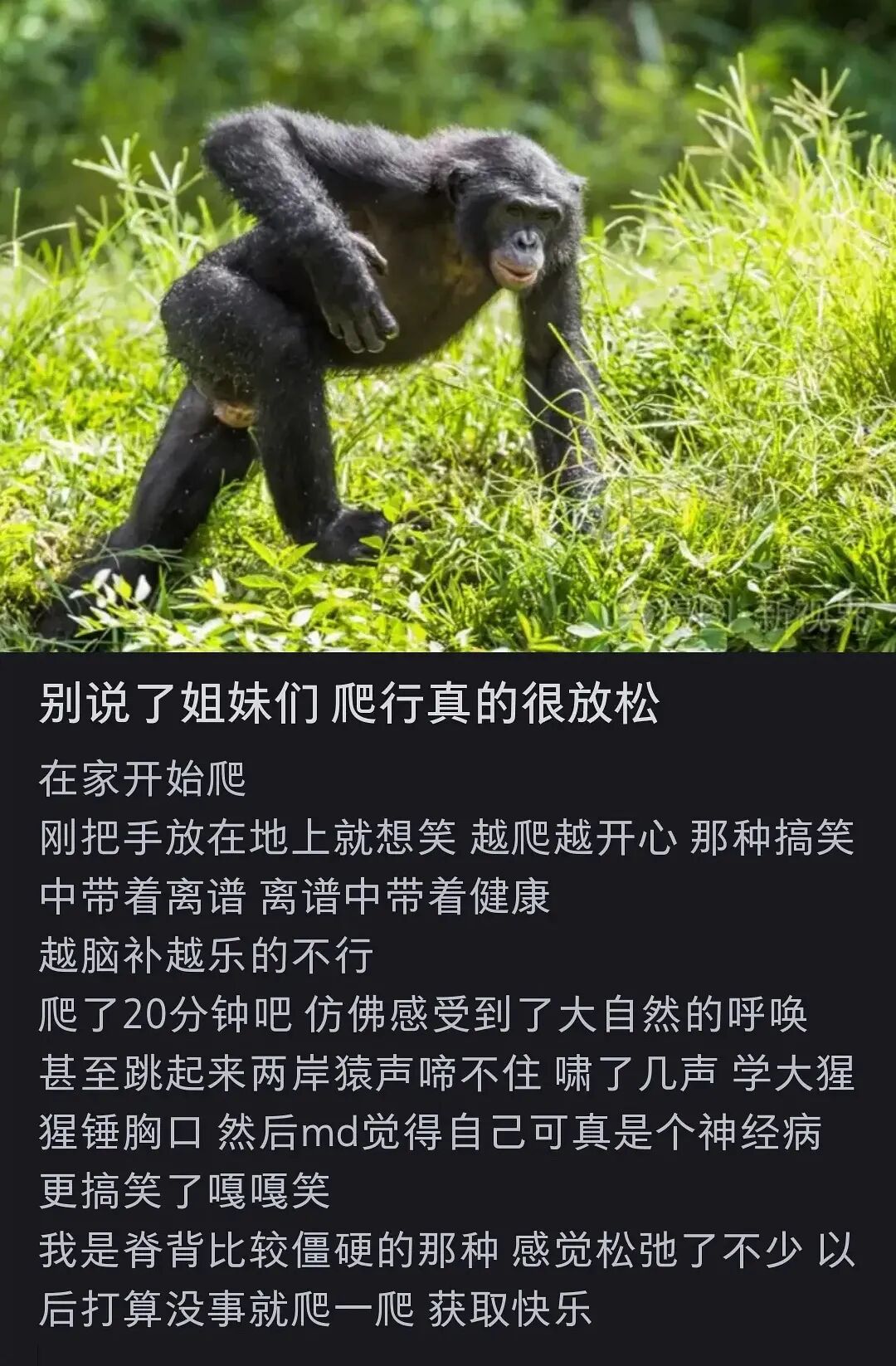 这样的行为看似荒诞,但不失为是一种行为艺术,这背后体现出大学生们寻找出了释放压力、丰富课余生活、增加社交活动的一条新途径。除此之外,B站体育类的up主发视频称,爬行其实是一个可以保持身体健康的训练。