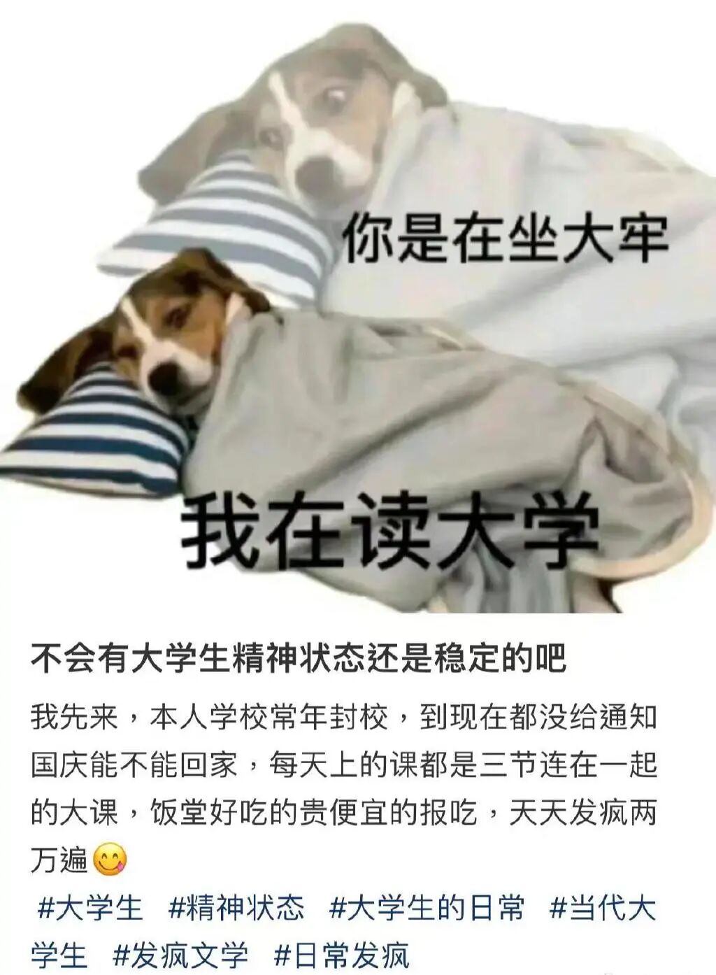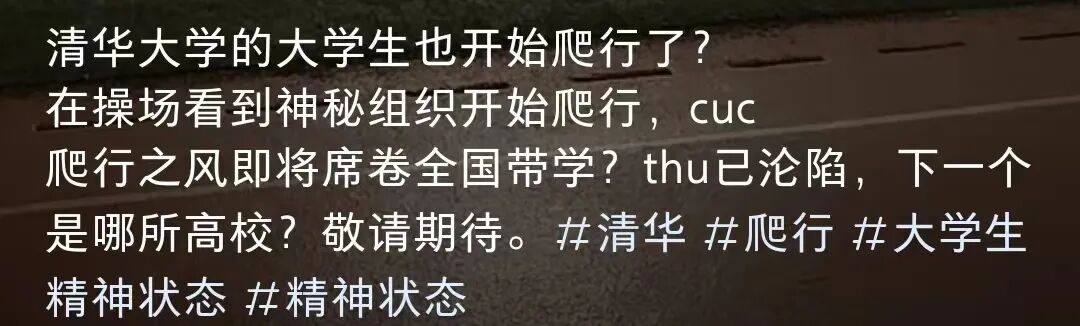 继发疯文学、宿舍养“纸箱狗”之后,封闭管理的大学生们又开始整“活”了——集体爬行。据说从中传开始,再到清华、人大等高校,爬行出现了“人传人、校传校”的现象......