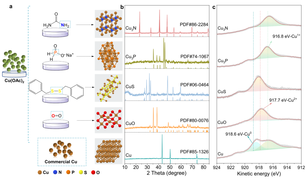 图1 预催化剂的合成和表征。(a) 预催化剂的合成方案。(b)Cu3N、Cu3P、CuS、CuO 和 Cu 的 XRD 图。(c) 铜基预催化剂的铜 LMM 俄歇光谱。